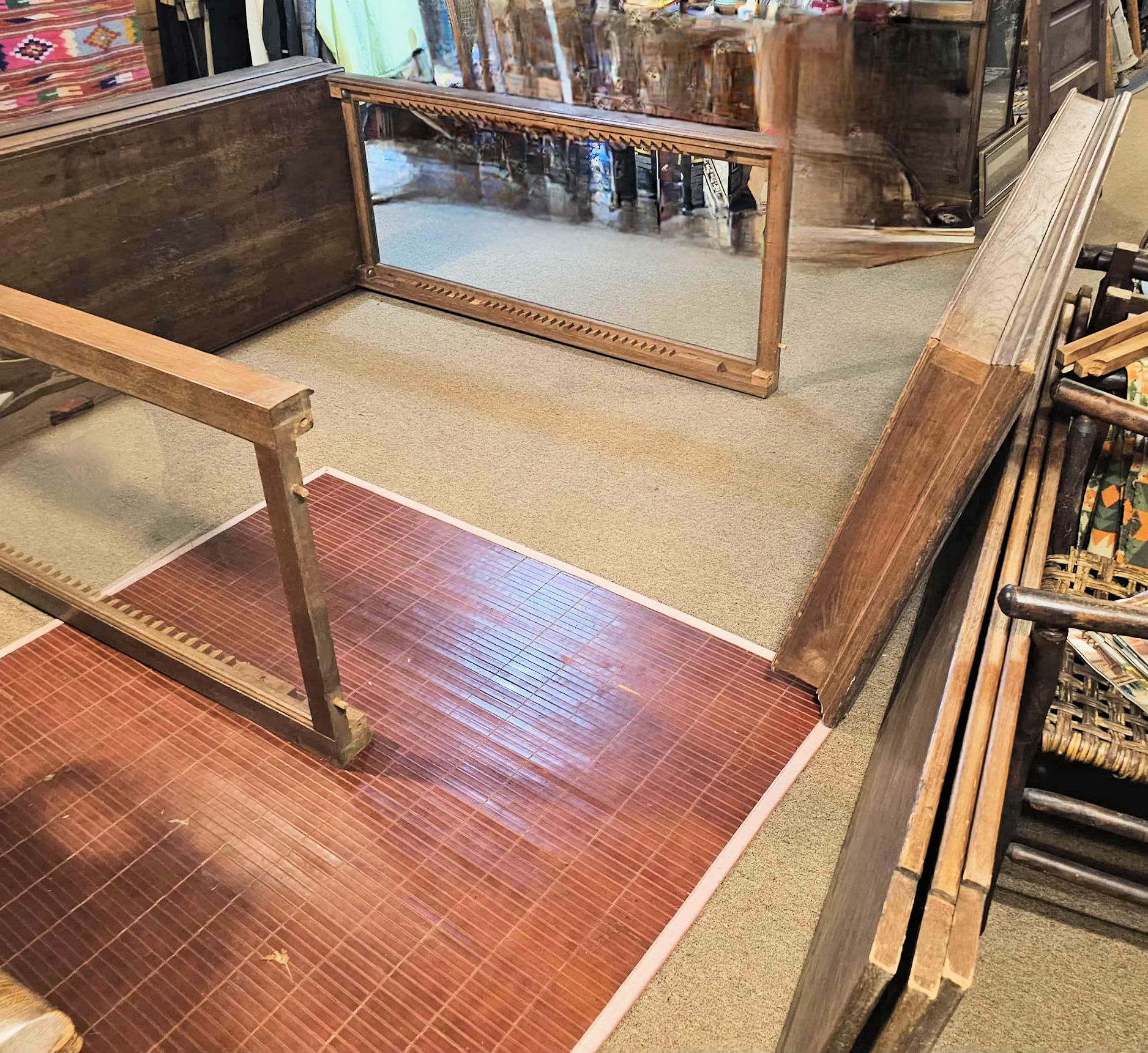 This is a very large oak antique haberdashery cabinet found in St. Paul, Mn. Perfect retail shop rack, display or personal collector's cabinet dating to the mid 19th century. Showcasing.can be done on each side and both ends with huge viewing capabilities through the heavy original glass. Door glass is missing and can be easily replaced. The door's on this piece open as they would a cupboard. Three large full dimensional shelves.