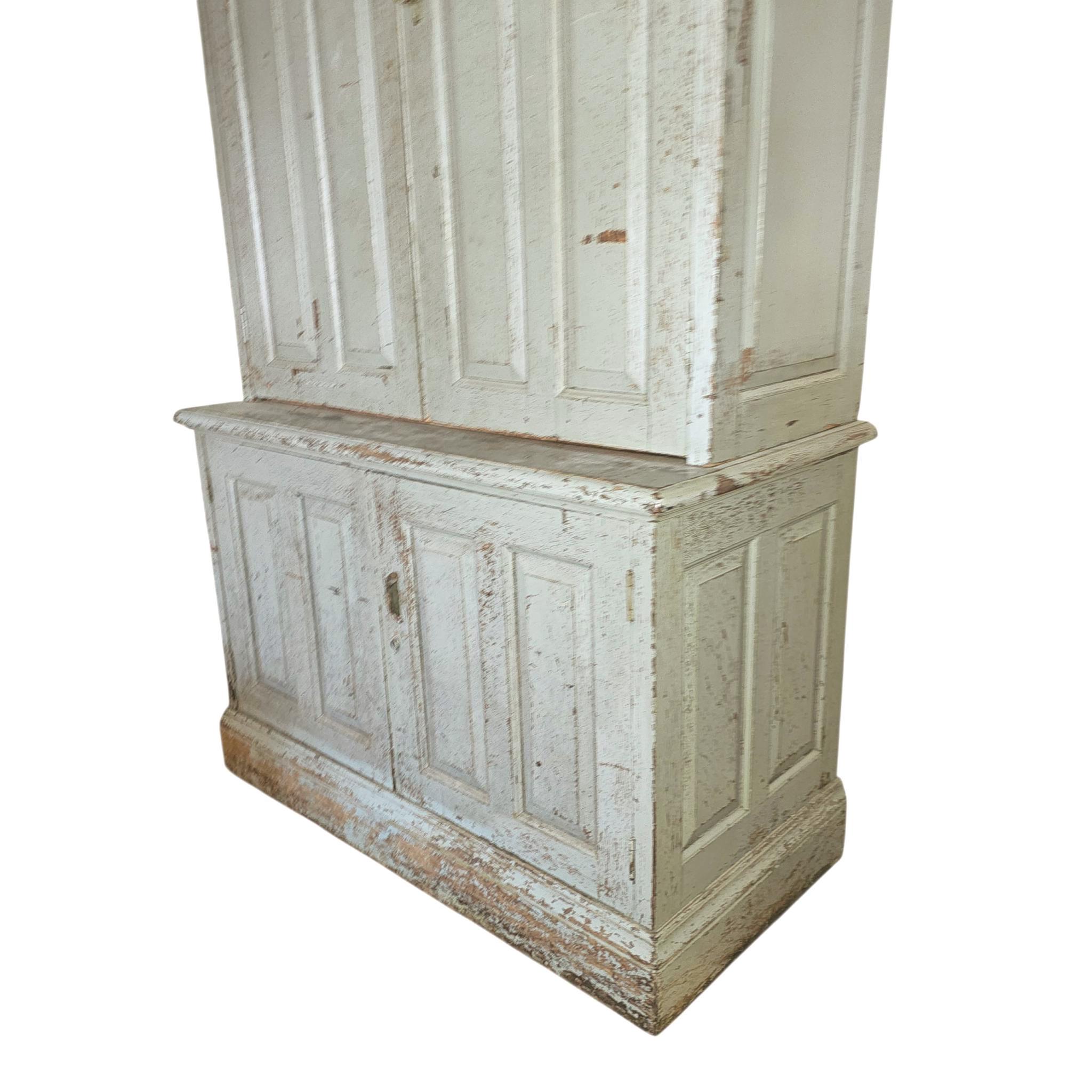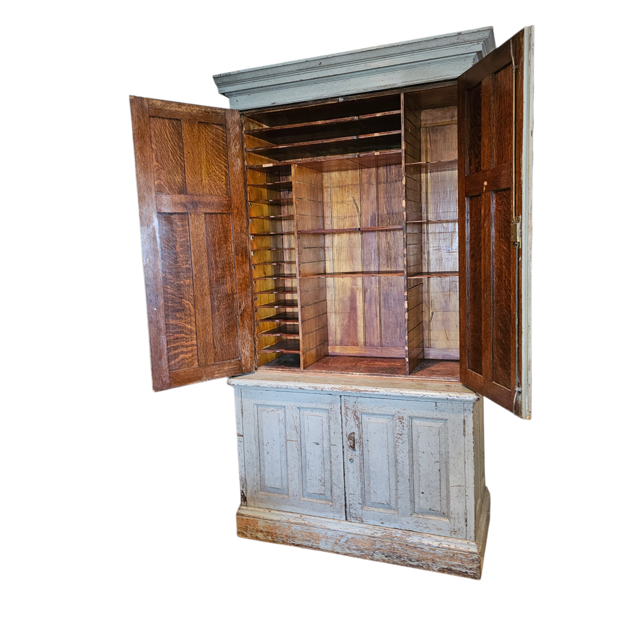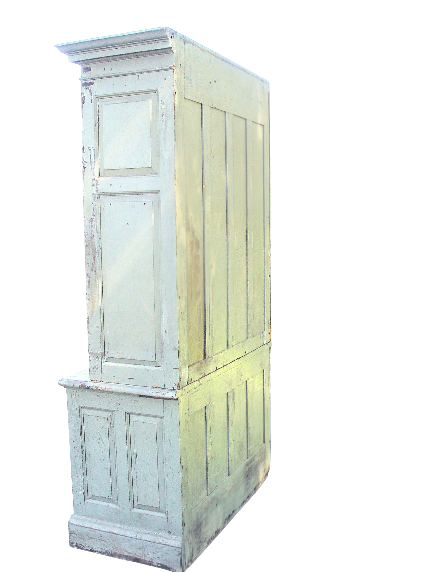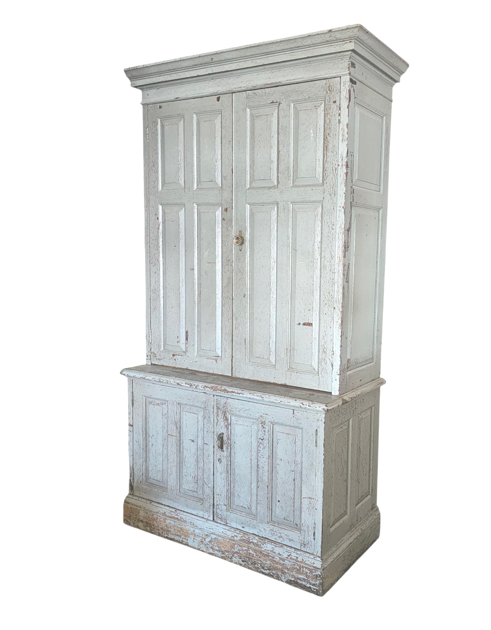 Early aged exterior paint, two raised panel cabinet doors on top and two on the base. This is a two-piece cabinet that is full of partitions and cubicles in the interior. Color is a soft mint green or grey with hints of blue. Top doors are sealed and locked with an original Cremone Bolt system. Lower doors seal nicely and have a sideways cabinet pull.