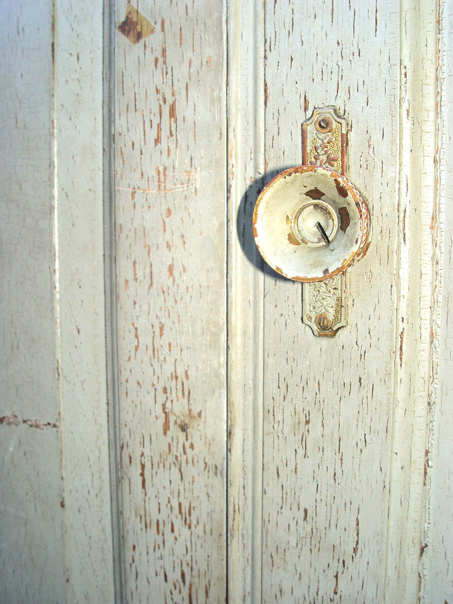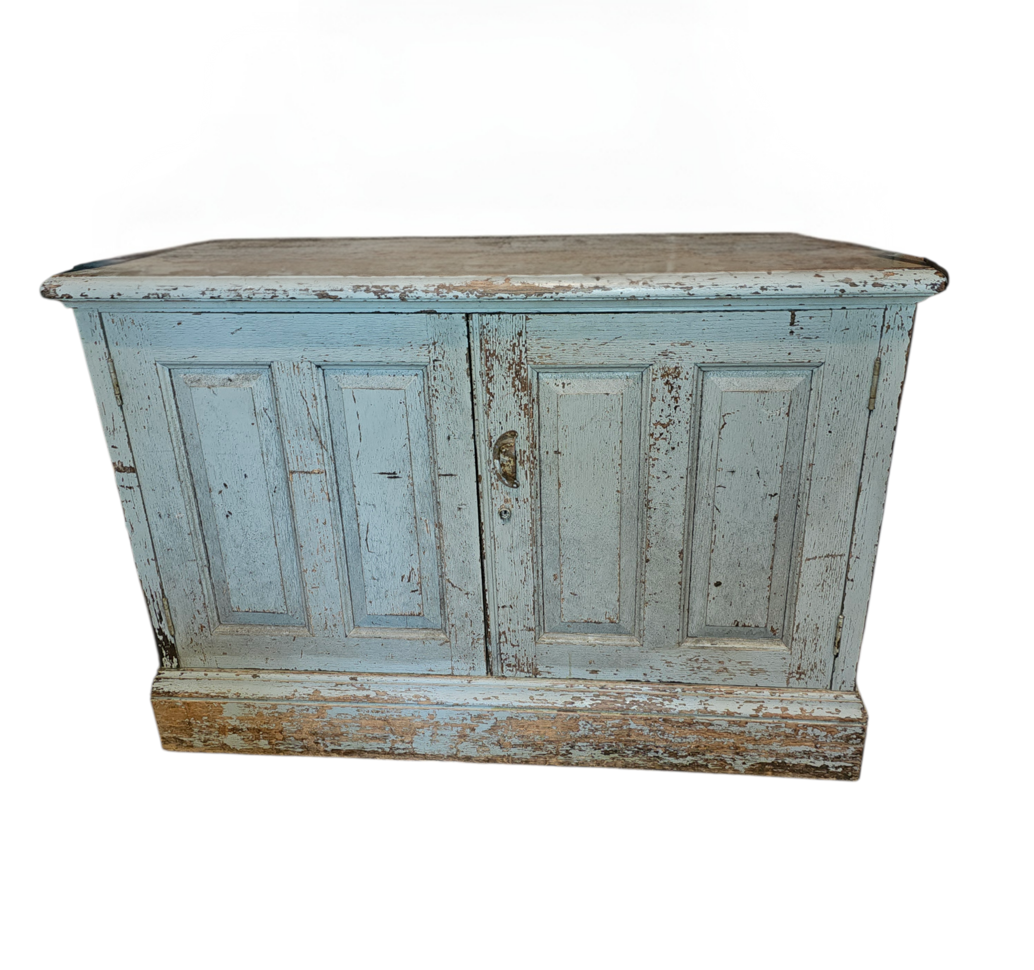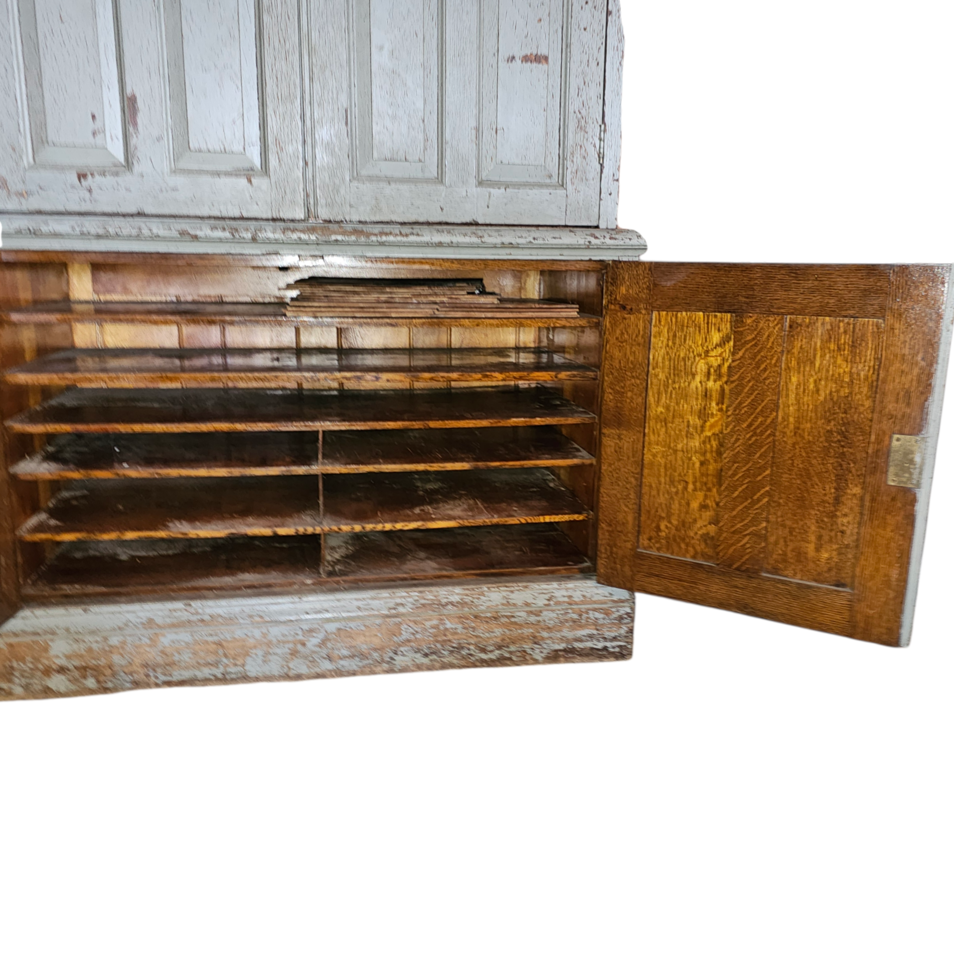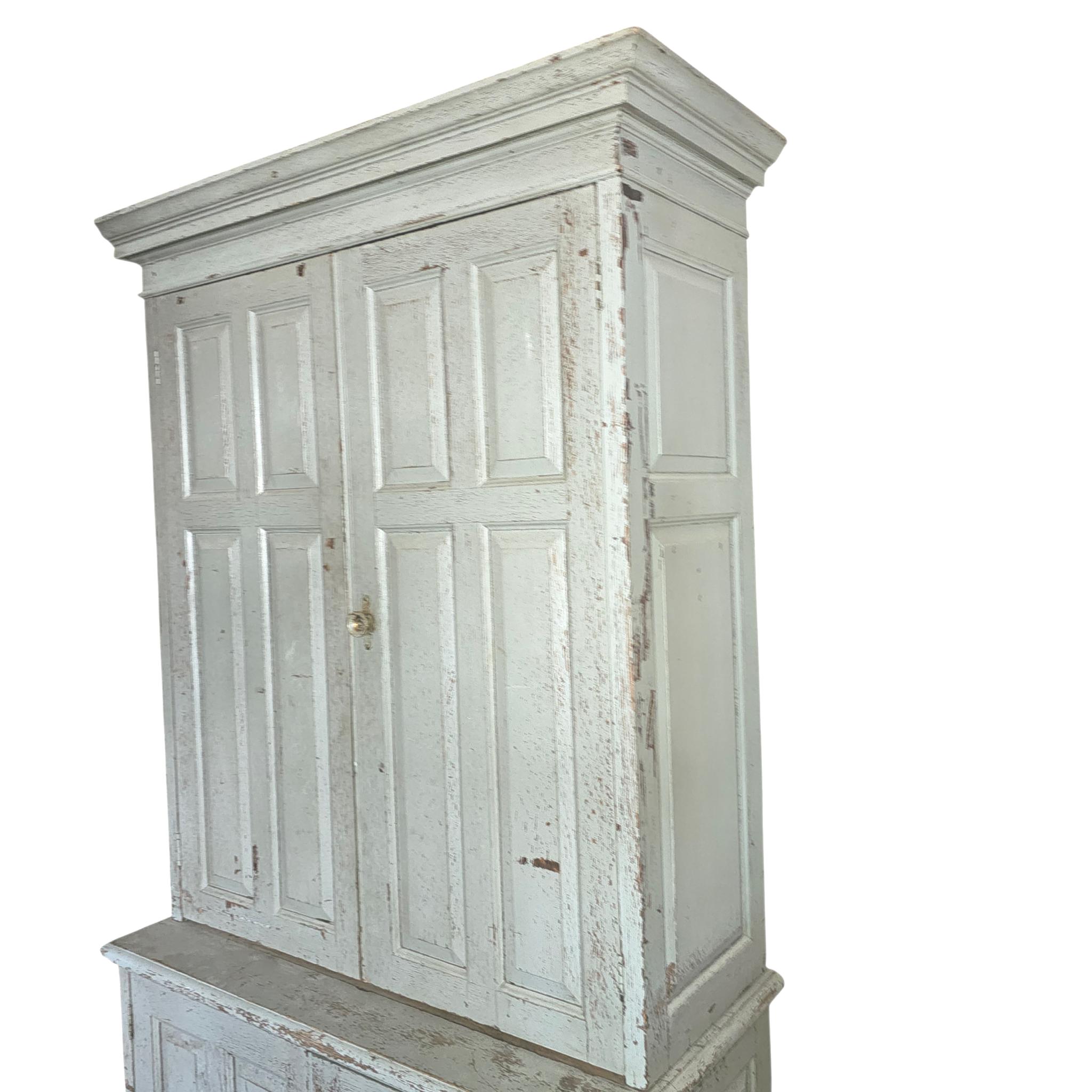 Early aged exterior paint, two raised panel cabinet doors on top and two on the base. This is a two-piece cabinet that is full of partitions and cubicles in the interior. Color is a soft mint green or grey with hints of blue. Top doors are sealed and locked with an original Cremone Bolt system. Lower doors seal nicely and have a sideways cabinet pull.