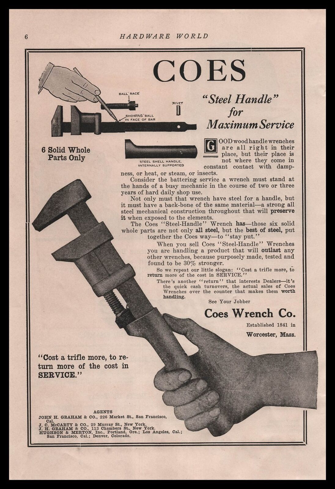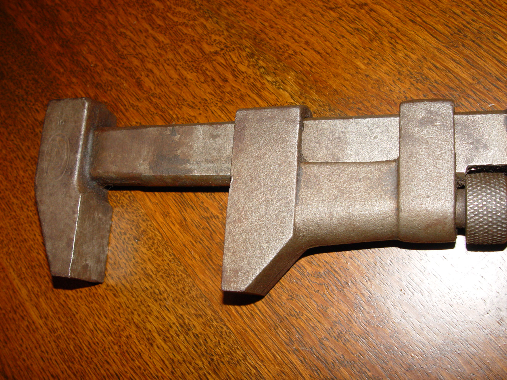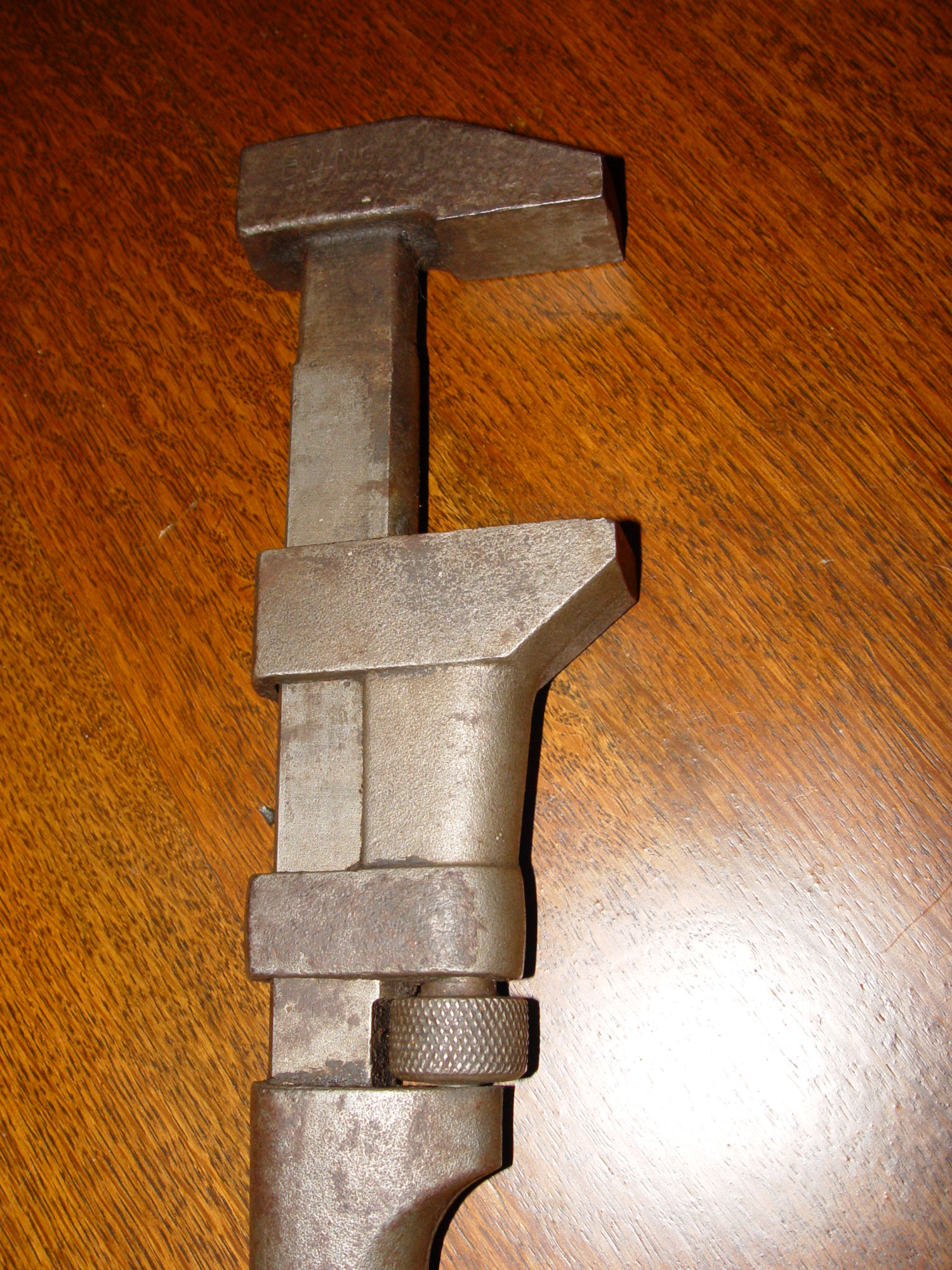 Heavy and in very good condition, not rusty, or dinged up. Solid bar handle with an incised 'B' on each side. The jaws have on one side Coes Manufacturing trade mark and on the other Billings, Made in the USA. They look like they have minimal wear if that.The threads and movement are all in good shape, smoothly adjust to a max opening of the jaw at approx 3" between the jaws.
