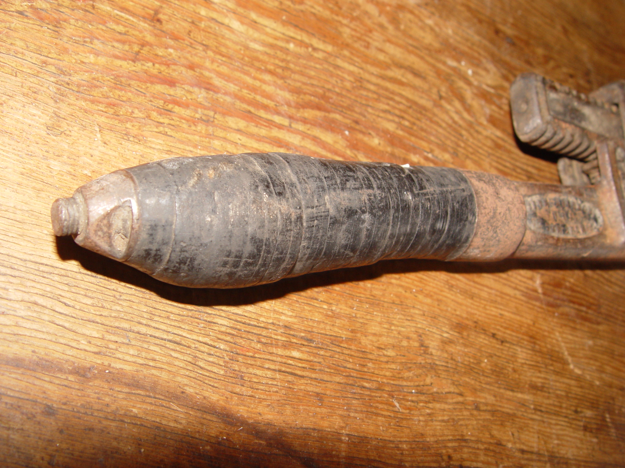 This is an estate purchase and the piece was definitely used and enjoyed so it needs a bath. I'm having trouble as the knife handle has the appearance of a leather wrap like a knife would be, but perhaps just grooved wood, personally, it's leather and just worn from handling. It very solid and tight I believe with a steel ferrule at one end and a nut at the other. The steel as with any used tool has a few small dents or mars but is very nice. The jaw teeth are in good shape, with very minor wear. A nice clean 19th century pipe wrench for Fathers or husbands, or a tool buff gift or your own collection.