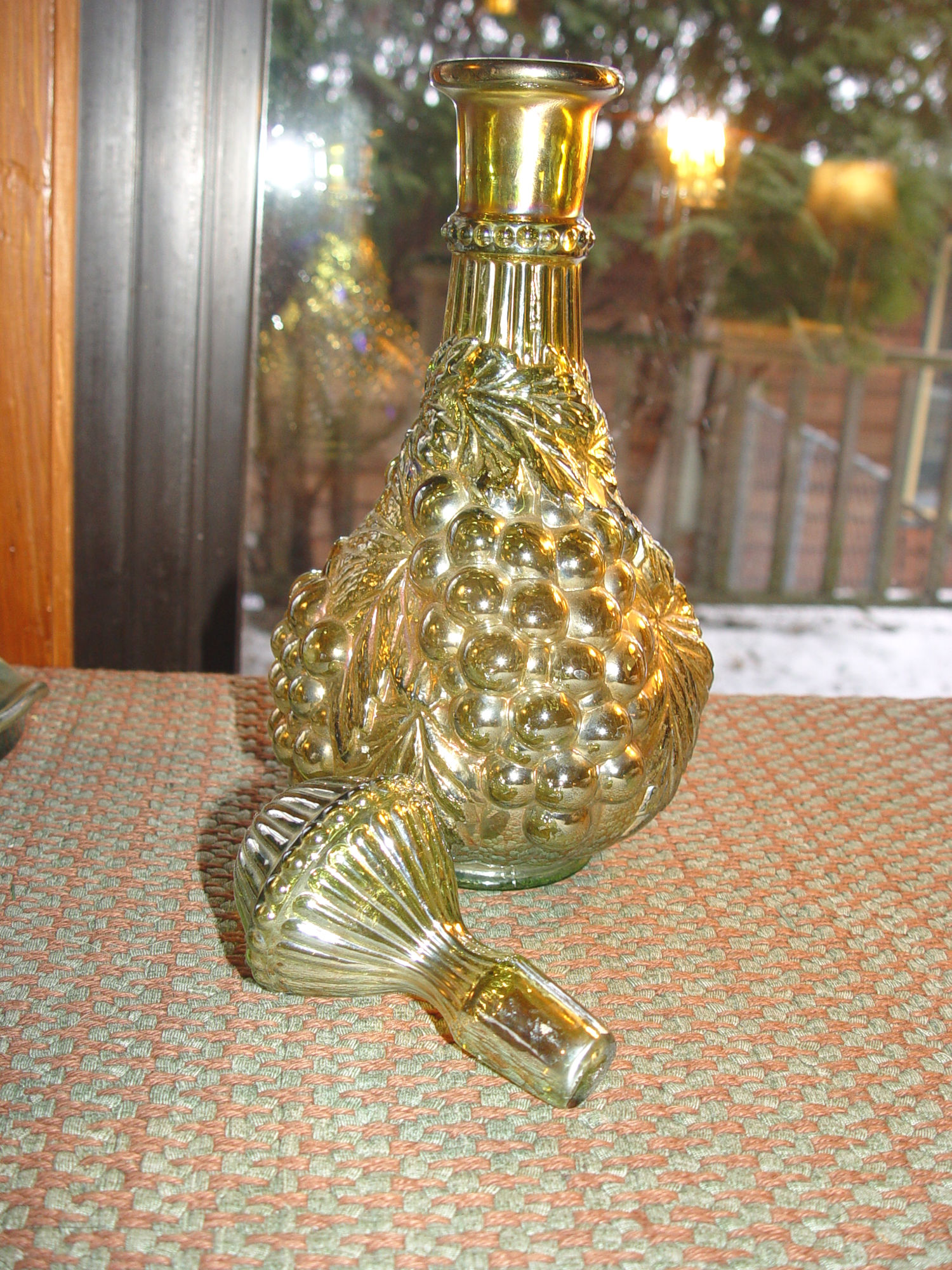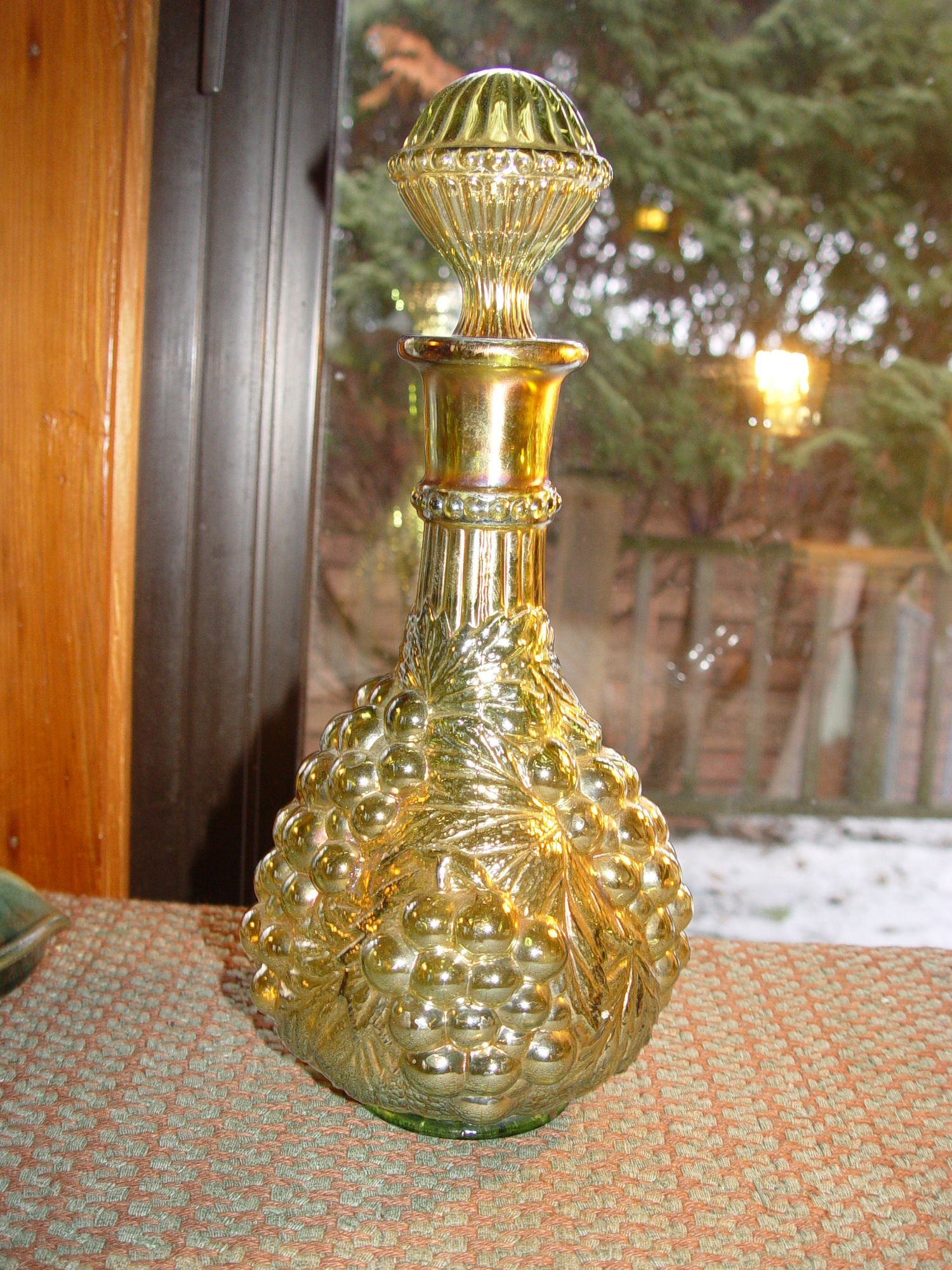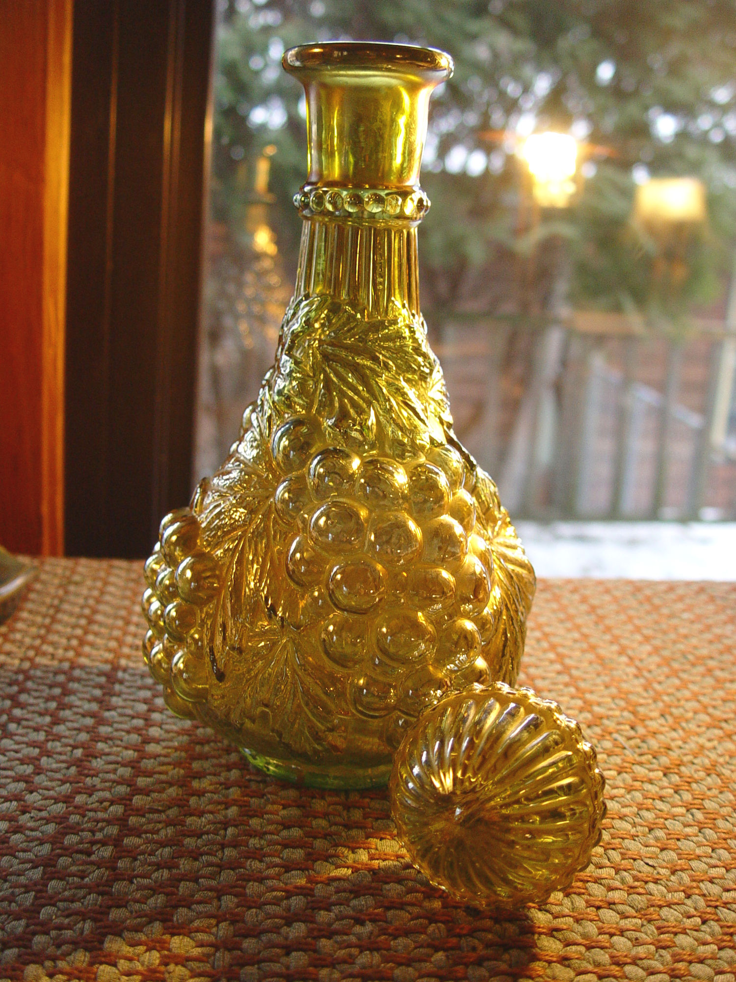 Mid-Century Imperial Amber Grape Glass Wine Decanter. A beautiful piece of Imperial glassware. The vase features a frosted amber finish and a lovely green tint. The pattern showcases a grape loganberry design, making it a perfect addition to any fruit and vegetable themed decor. Wonderful gift idea.