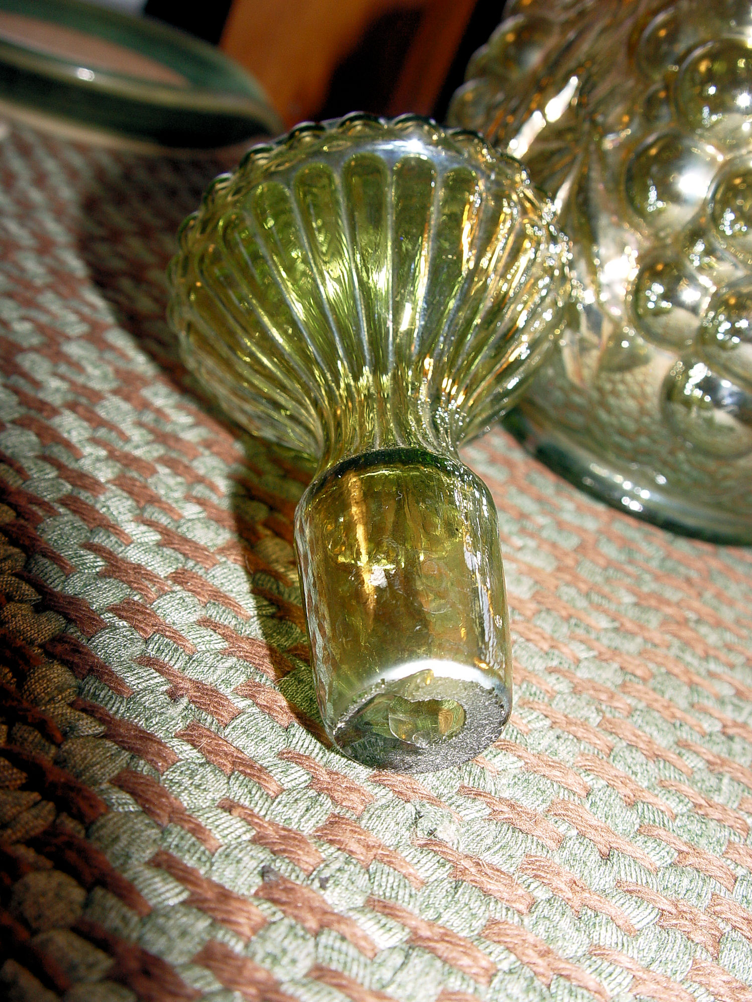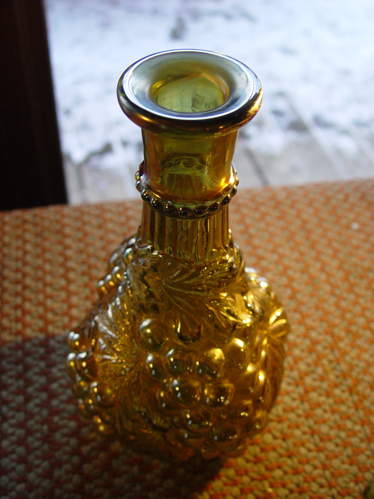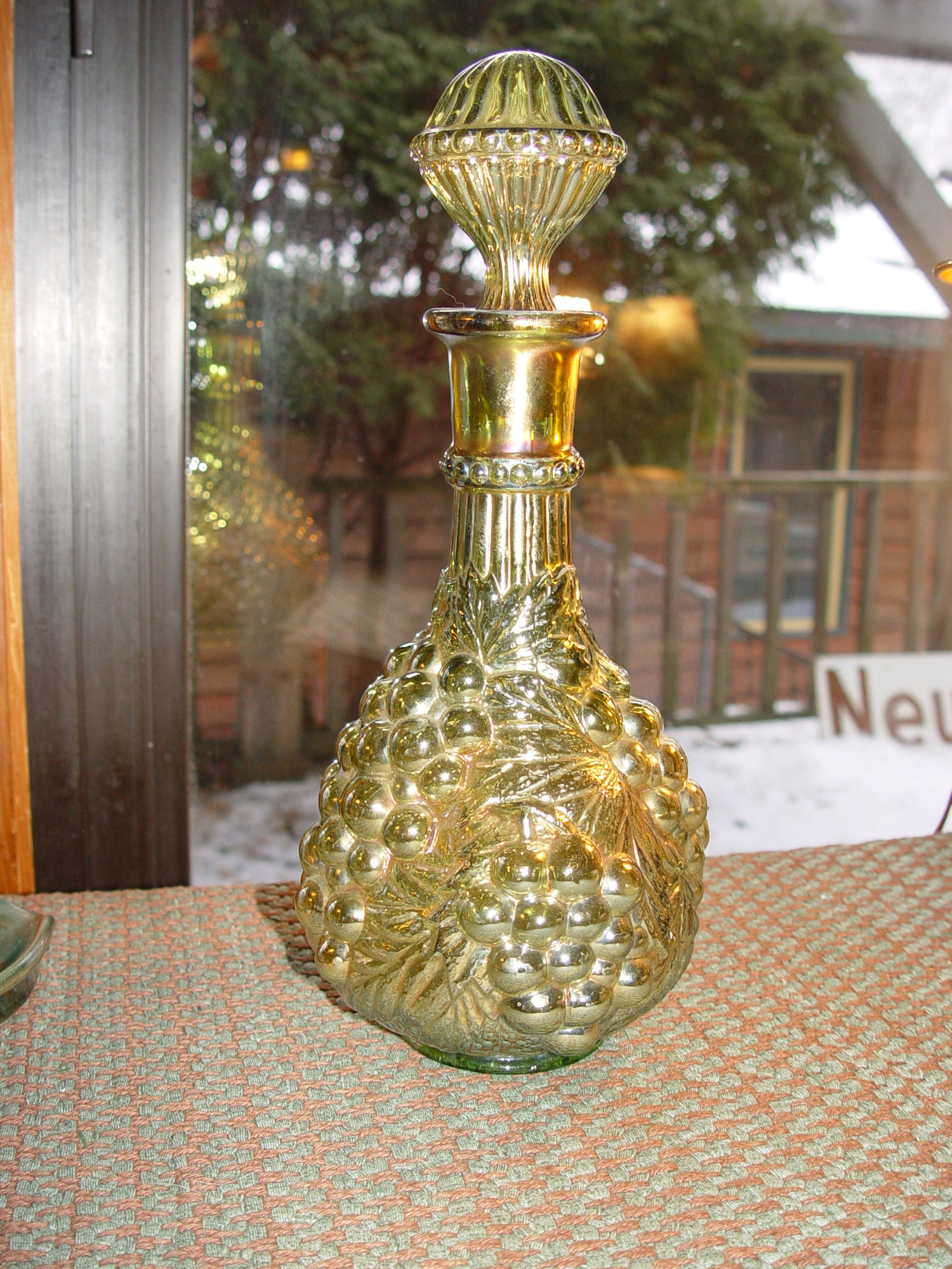 Mid-Century Imperial Amber Grape Glass Wine Decanter. A beautiful piece of Imperial glassware. The vase features a frosted amber finish and a lovely green tint. The pattern showcases a grape loganberry design, making it a perfect addition to any fruit and vegetable themed decor. Wonderful gift idea.