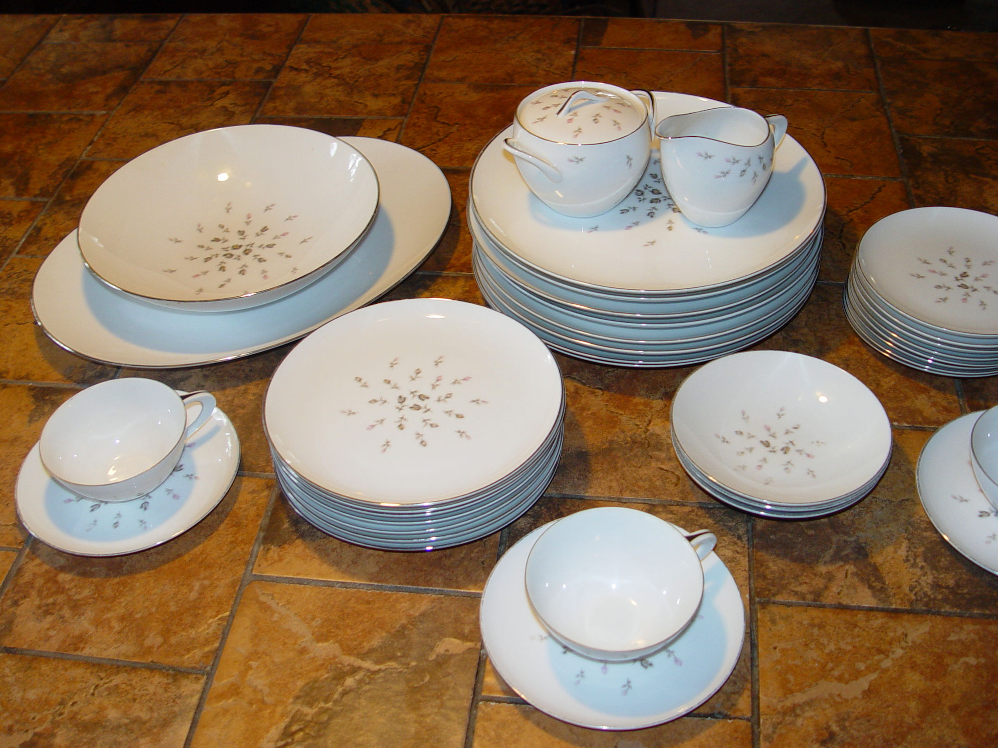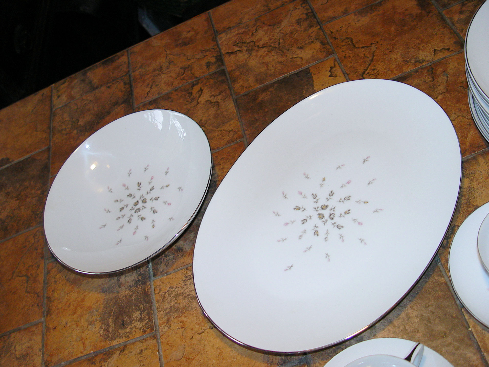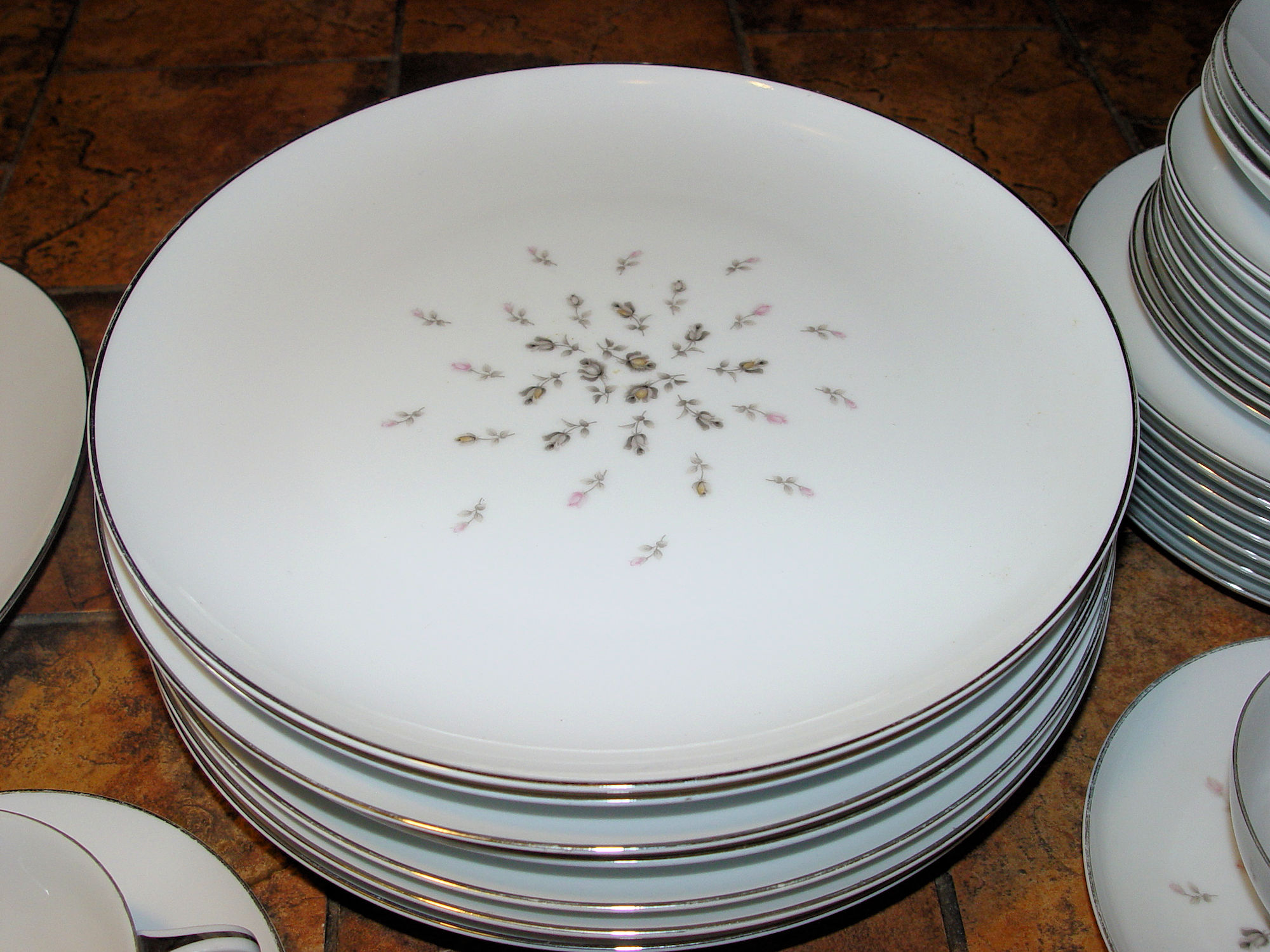 This classy set boast a white background with tiny pink and gray rosebuds. All have a platinum trim.