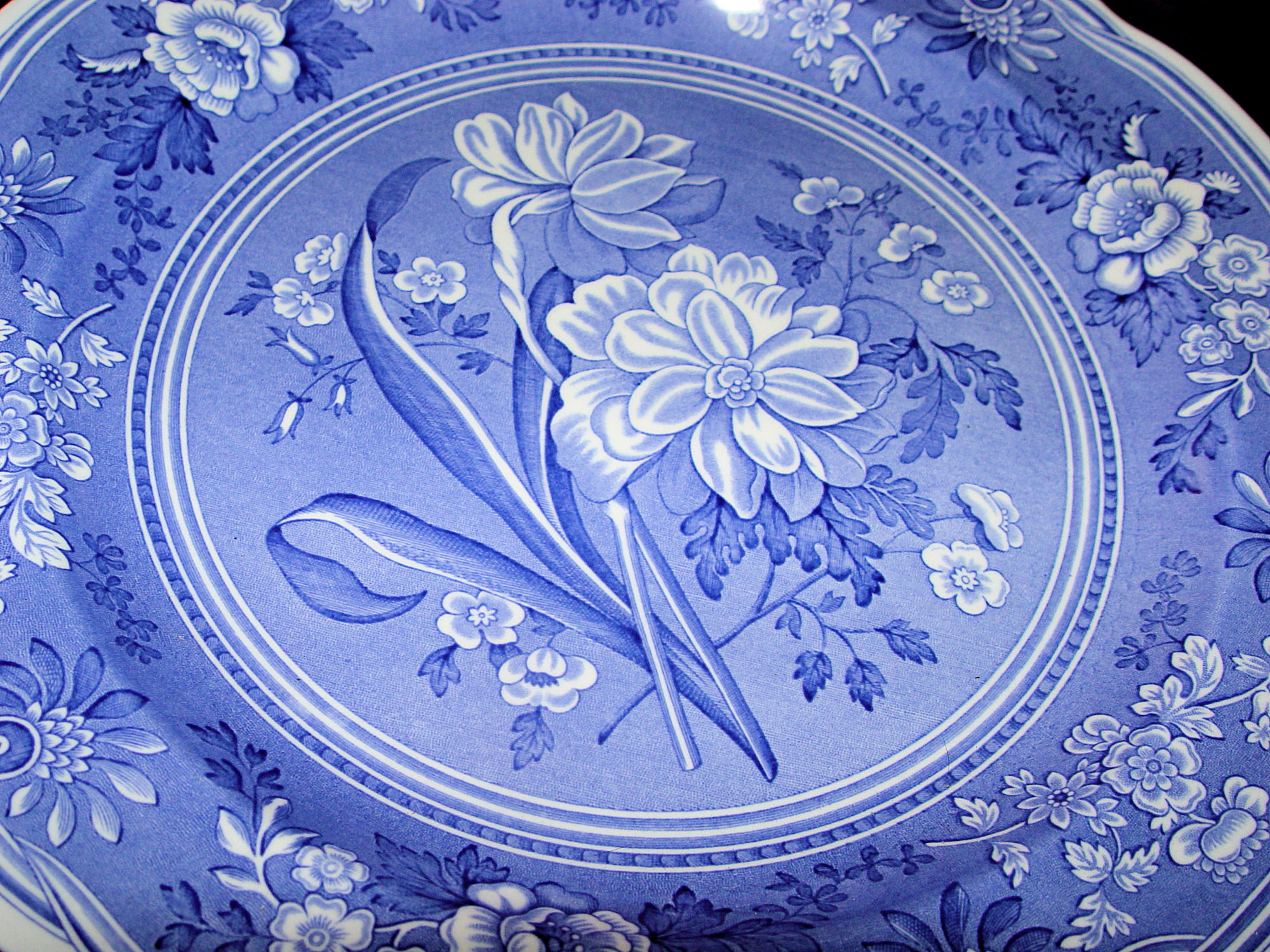 The Blue Room collection is named for the display room at the Spode factory where a wide assortment of blue and white transfer-ware in archival patterns was exhibited. Medium varied blue background with blue and white flowers.