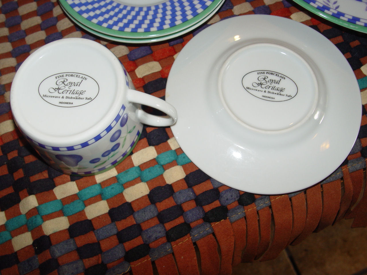 This is a set of one dinner plate, four saucers and one cup ~ Royal Heritage Fine Porcelain RHR1 pattern. Beautiful blues and greens.