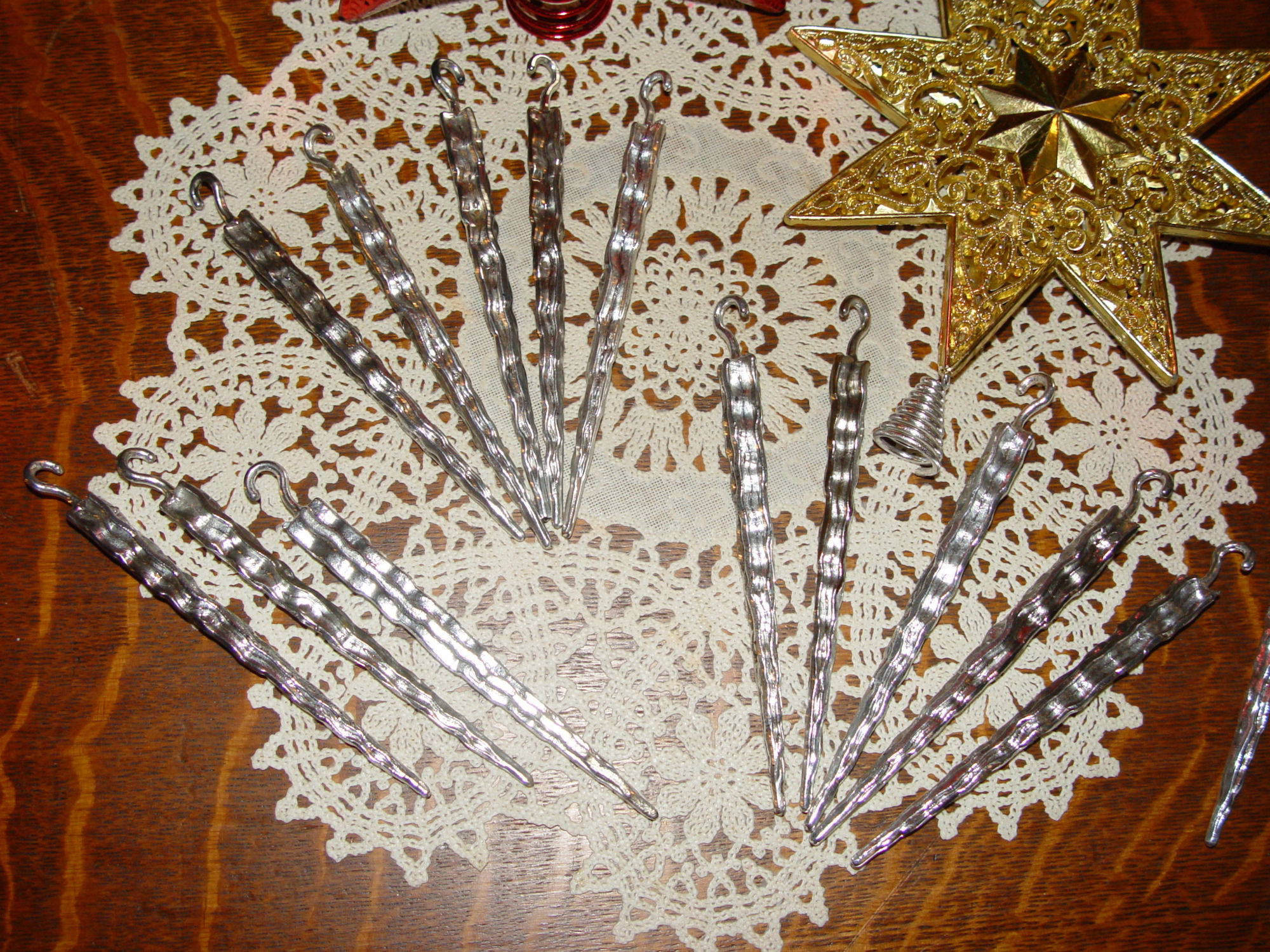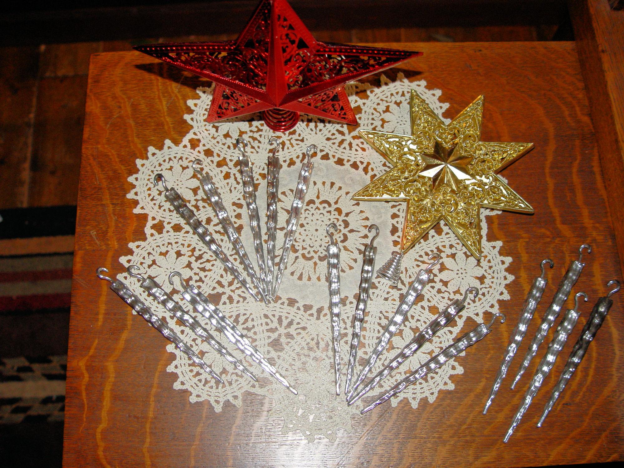 An ornate gold hard plastic with decorative designs measuring approx. 7" by 6" and a larger dark red light metal or tin, also with cutout design measuring approx. 8" by 8". Included are 17 silver plastic ice-cycles with a modeled attractive appearance. These measure approx. 5.25". Some of the old silver is rubbed off of a few. These I believe are 60's - 70's era.