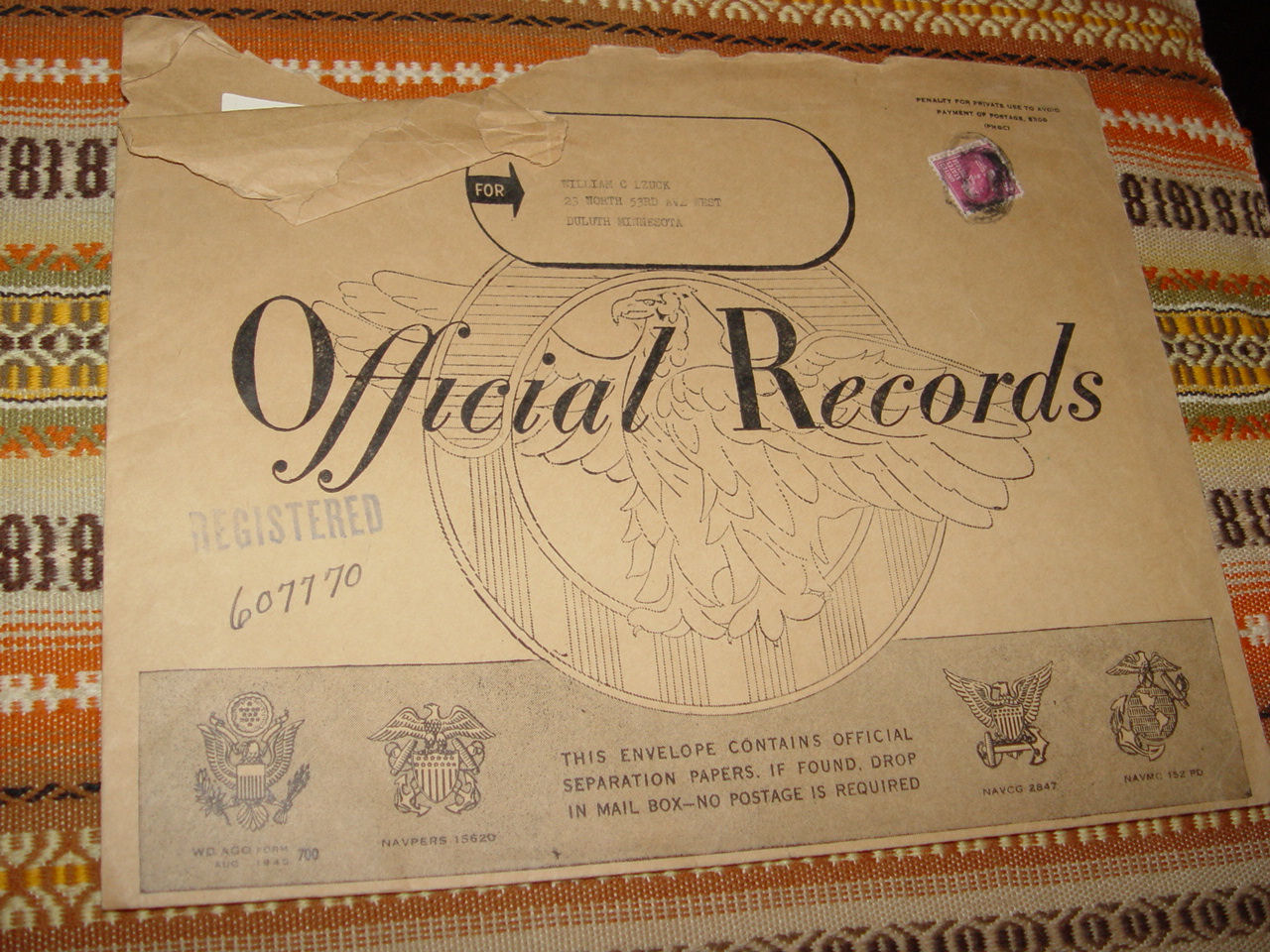 Very interesting official packet for the marine, William C. (Carl) Dzuck, USMCR. William was born in Duluth MN. April 30th, 1928 and died May 4, 1996 at age 68 in Hubbard Cty, MN. His wife, Esther Kleeb-Dzuck was born in Tracy, MN in 1913. Believed to have a brother - Clarence E. Dzuck. Excellent piece of history for both his military career or genealogy.