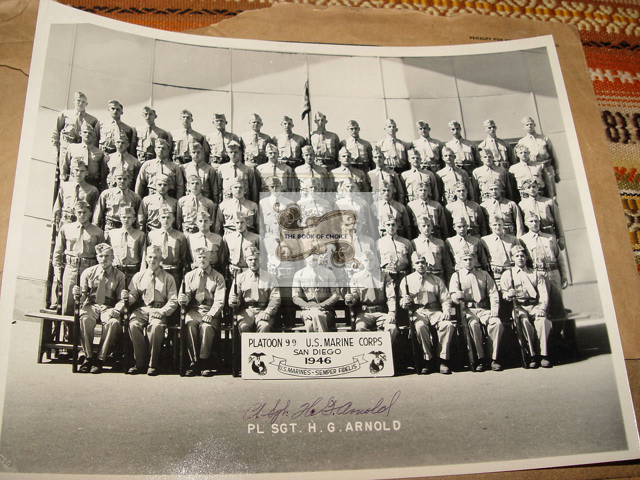 Two excellent photos of Platoon 99 at the Marine Corps Base in San Diego, California. 1946. US Marines - Semper Fidelis. Platoon Sargent H. G. Arnold hand signed the photo with the roster on the back.