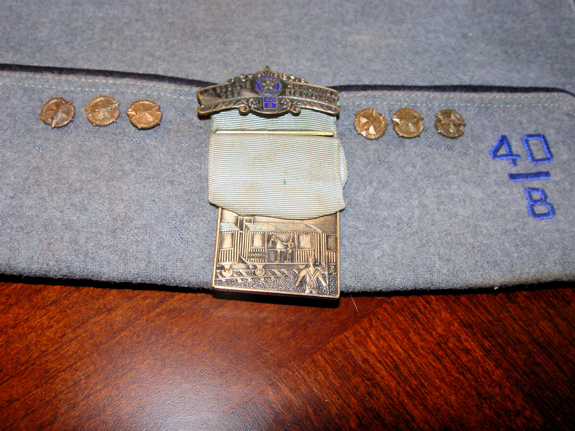 Circa 1920s, this Societe Des 40 Homme 8 Chevaux 40/8 Forty & Eight antique enameled medal ribbon pin brooch with Commissaire Intendant, beautiful vintage badge of honor shows a horse in a railroad boxcar. Americans were transported to the battle front on French trains within boxcars stenciled with a “40/8”, denoting its capacity to hold either forty men or eight horses.