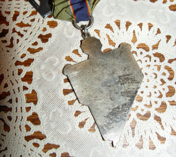 Brand stamp on back looks like English hallmarks. Very cool piece that I've had with many others. Just decided to let them go. There is a very neat scene on the front....Airplane, Show girls, Cowboy, Dam and more. 1962 below in blue numbers and blue background behind other lettering. State shaped Medal