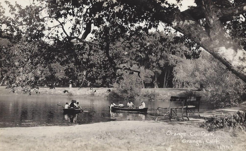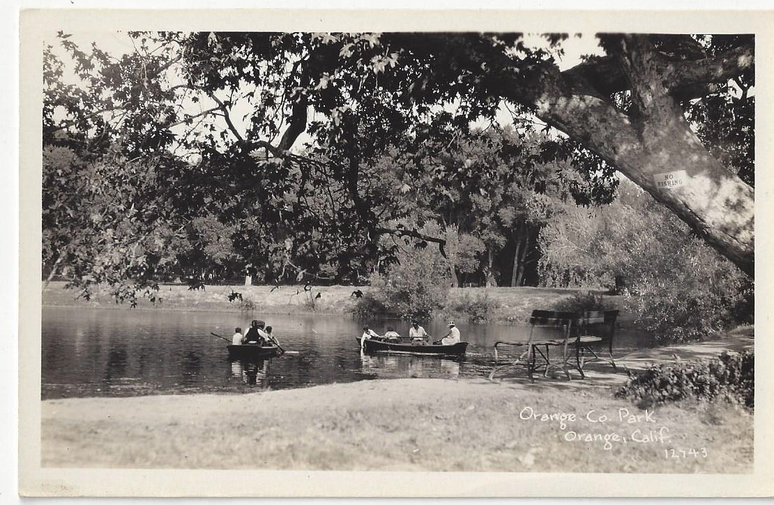 Obviously a nice early Summer day in sunny California. Orange County Park in Orange California. Early 1900's. Boaters and Canoes on the lake with park benches in the foreground.