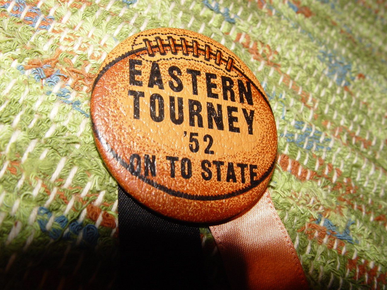 Textured to look and feel like a leather basketball. Measuring approx. 2.25" in diameter for the button and 4.25" long in total. This is a very nice early pinback that is showing black lettering - Eastern Tourney '52 On To State. Orange and black ribbons dangle from the button and the factory maker shows on the back 'Union Label'.