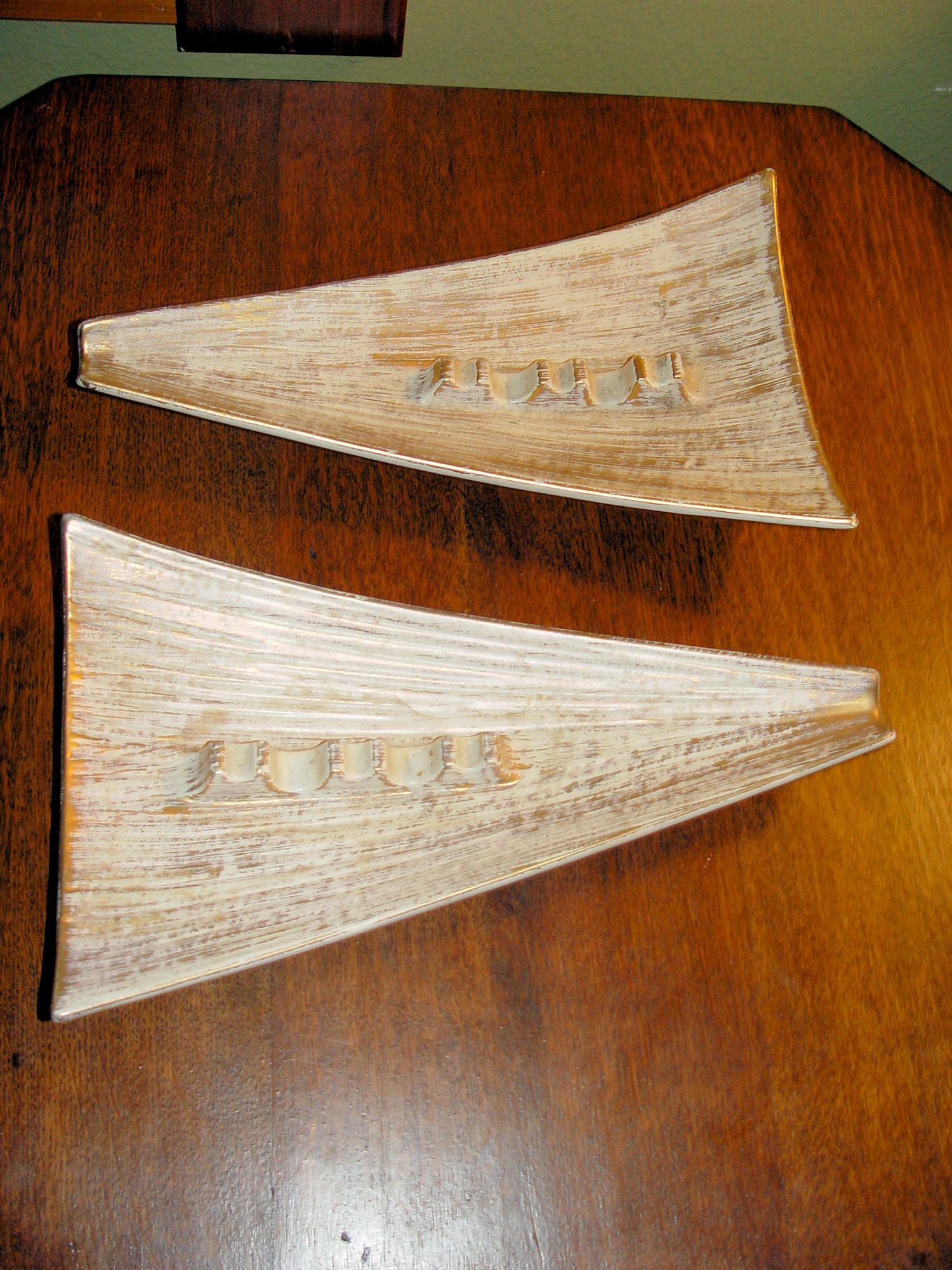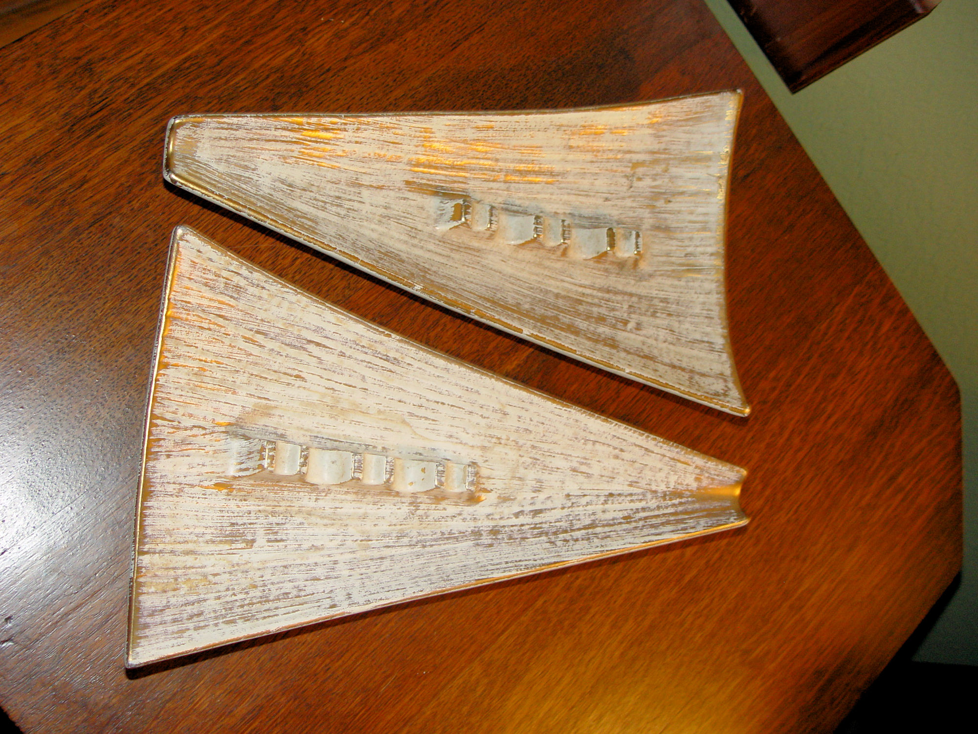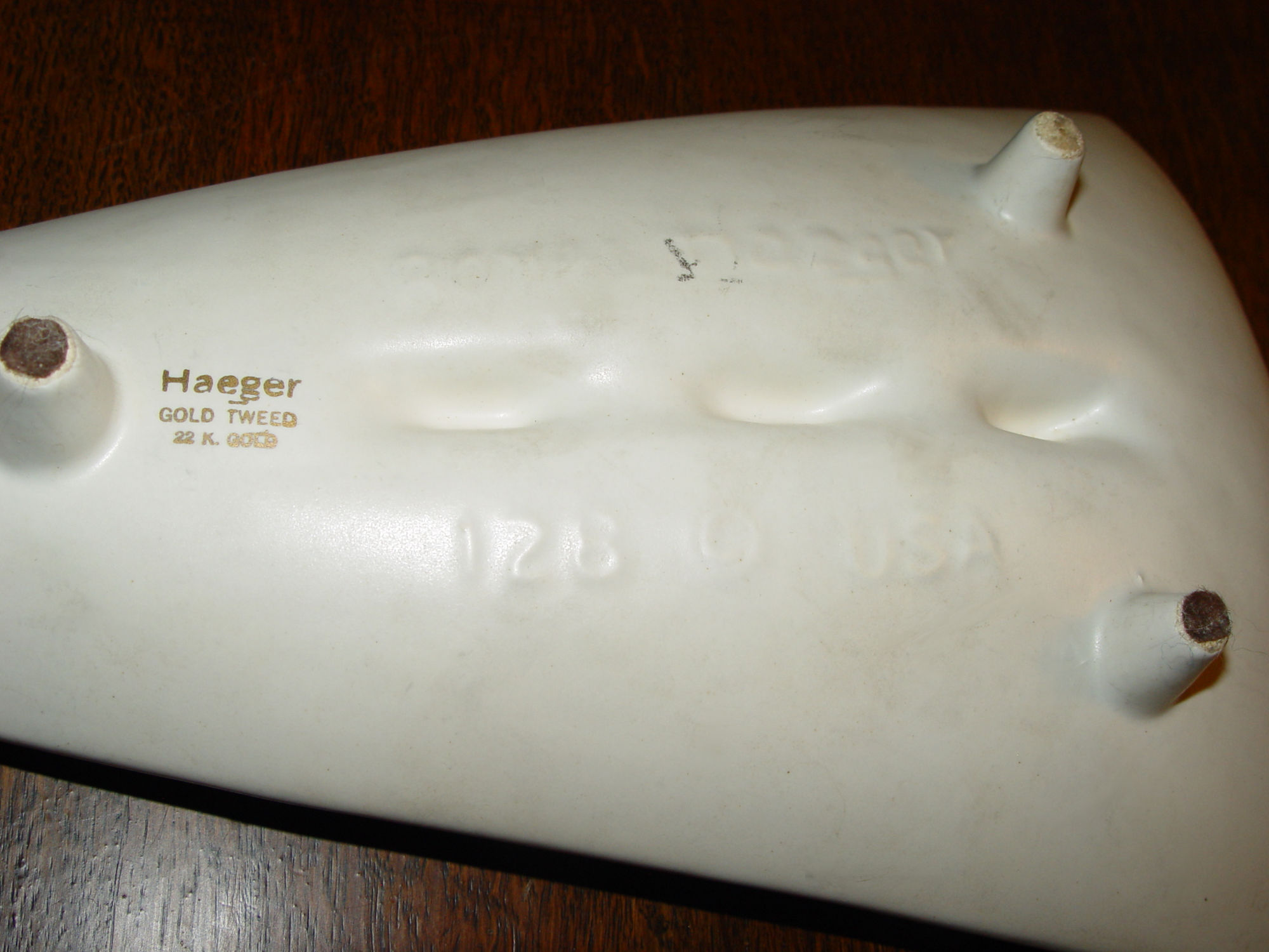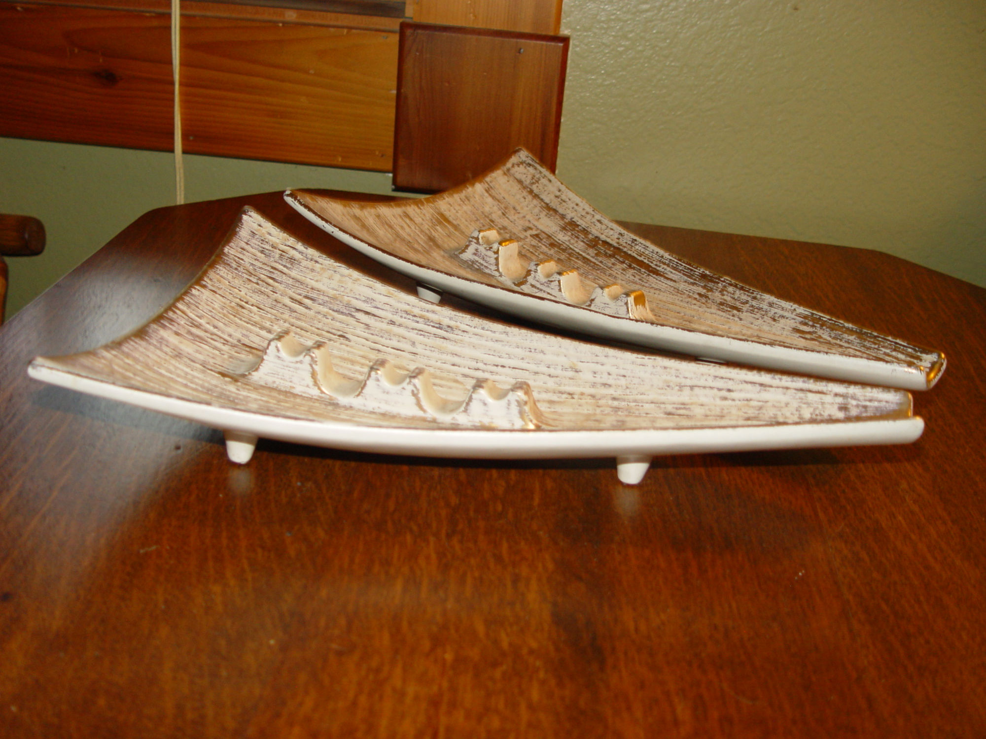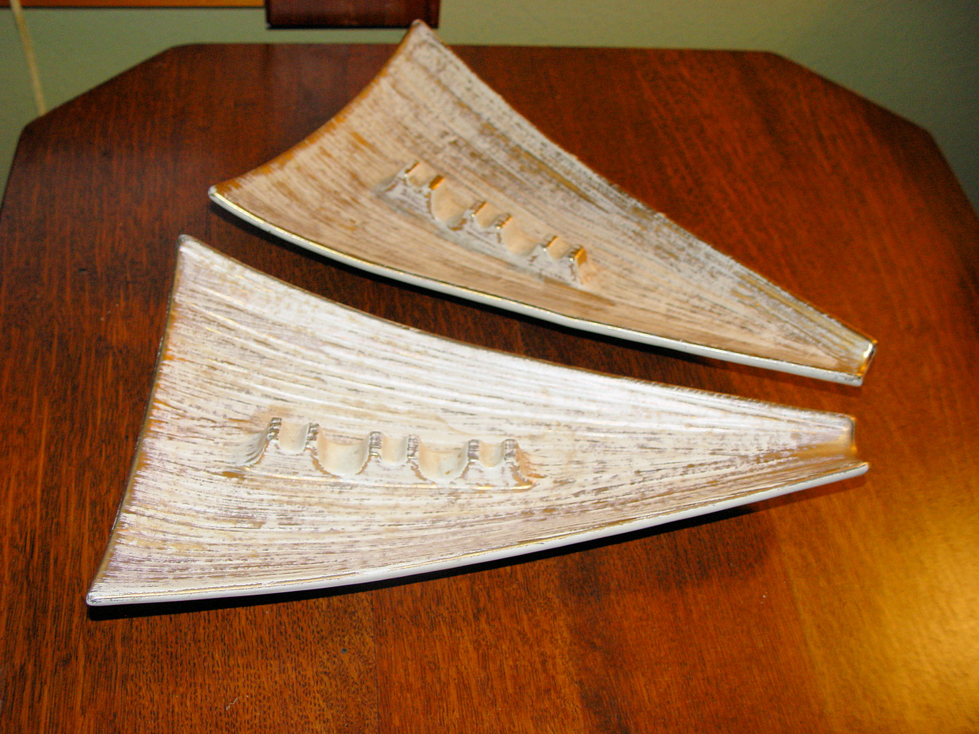 Hard to find triangular shape in Mid Century Modern, Haeger #128 pottery ashtrays. Brushed with 22K Gold and referred to as Tweed. The cream color and gold really stands out. Both are stamped Royal Haeger, 128, USA on the bottom and one has the Haeger stamp showing the 22K gold tweed. Both in extremely nice condition with no chips, scratches.