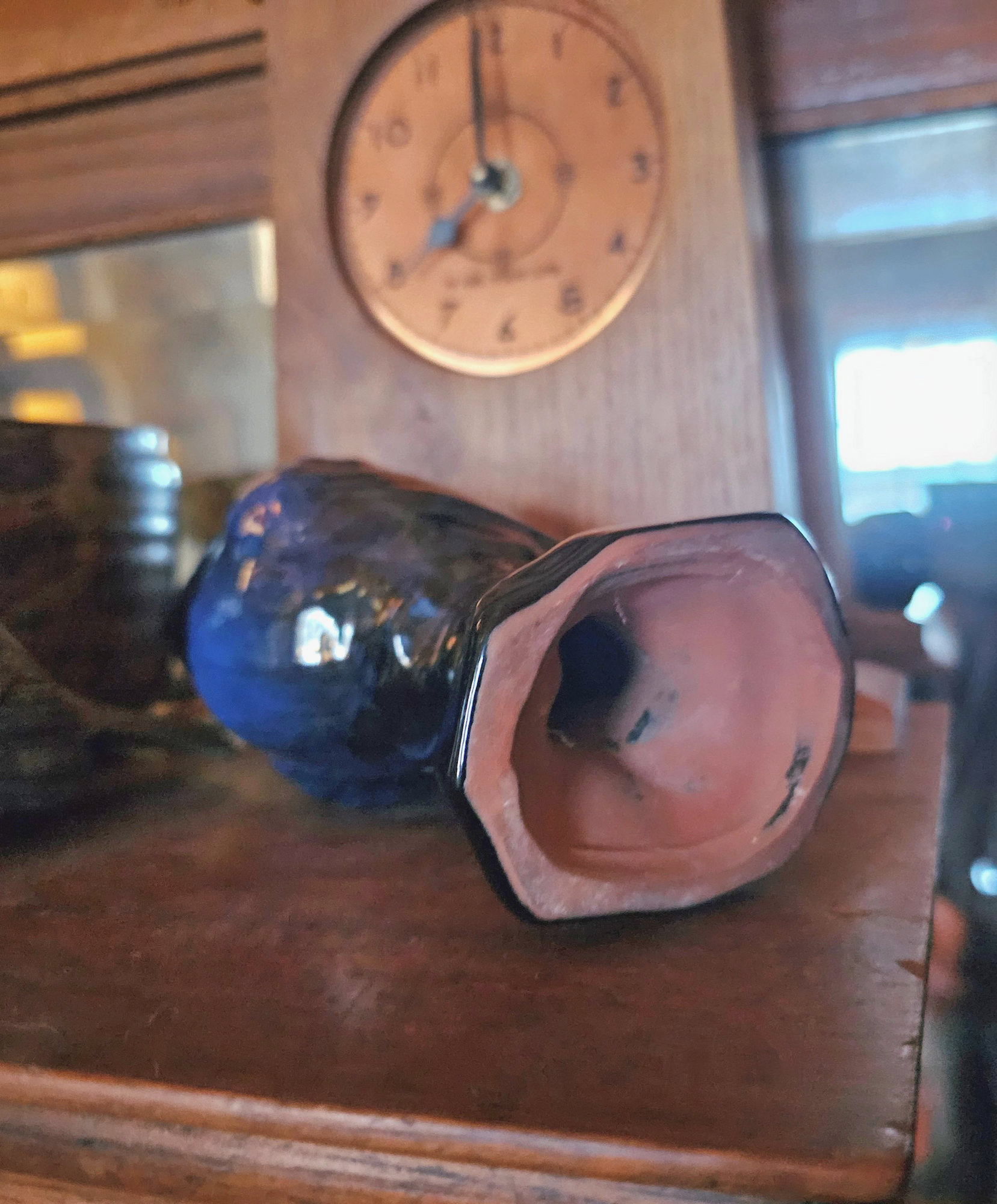 Vintage Canadian Pottery Owl Figurine, Blue Drip Glaze Redware