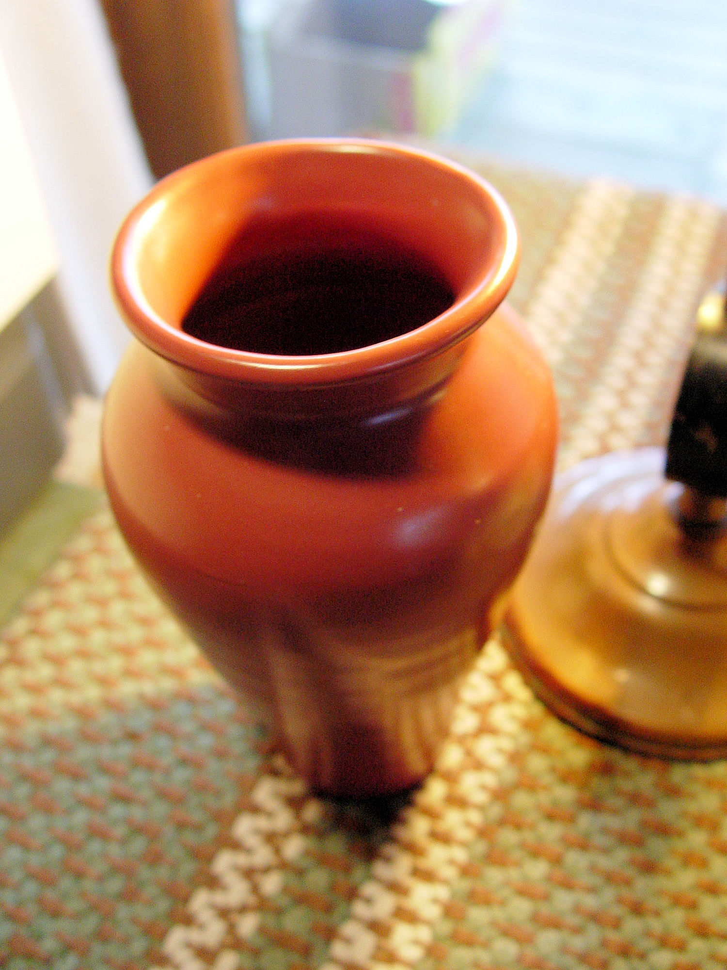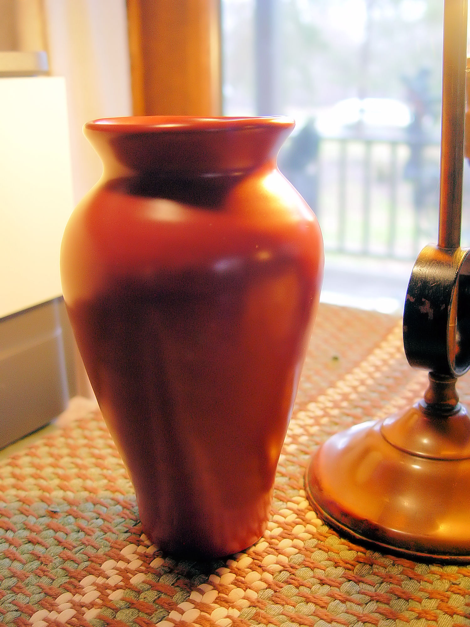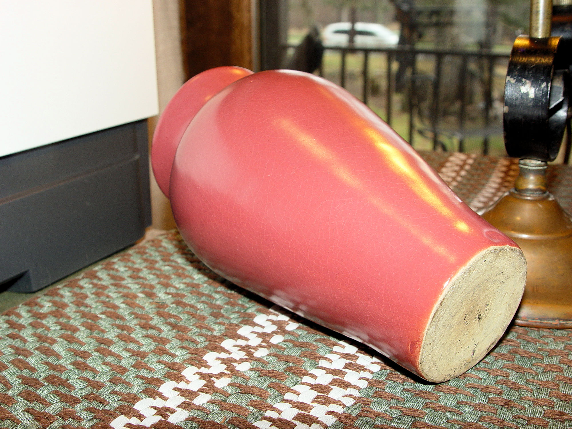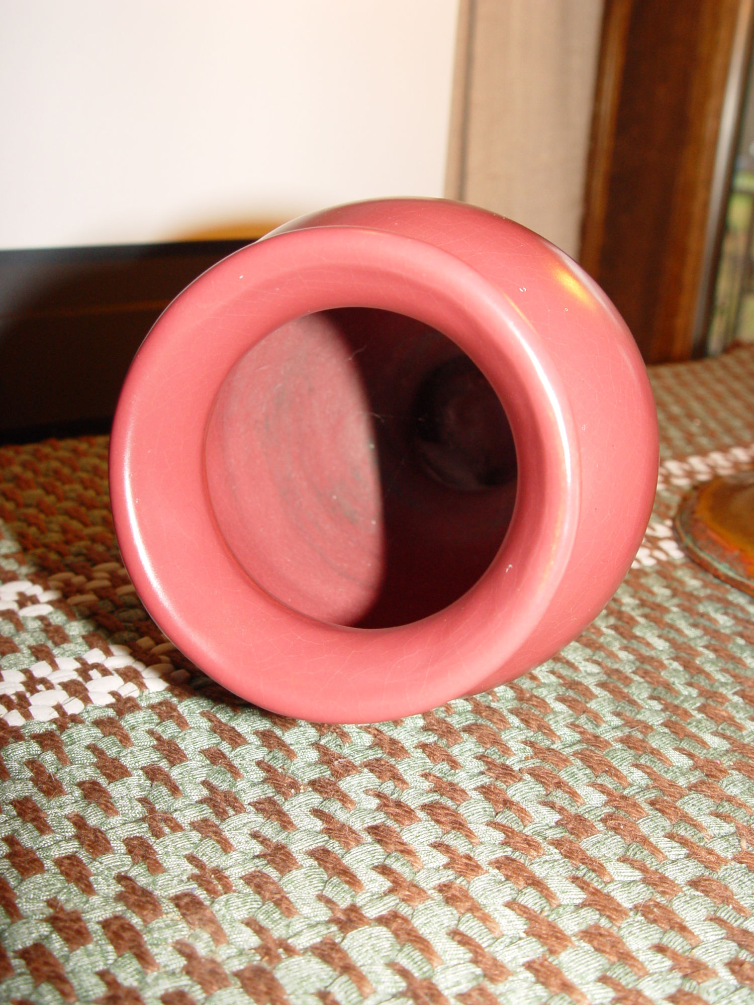 This is a unique early 20th c. piece of pottery that I believe is Ohio, not sure. Period Arts and Crafts era with a beautiful mauve or rose colored glaze. This stands approx. 7" tall with a girth of 4". The mouth measures 3" and the base is approx. 2.25". Looks to be a factory piece.