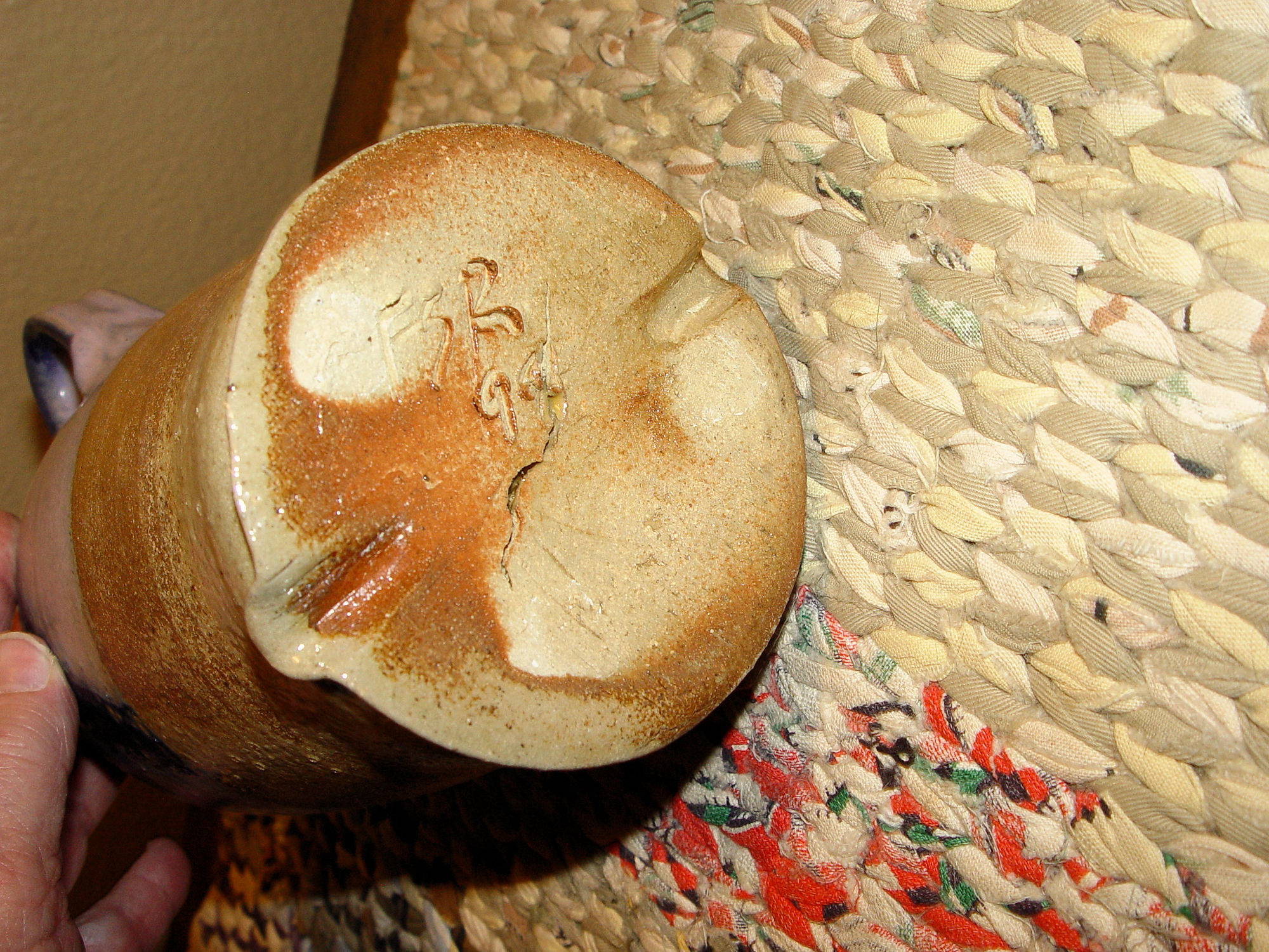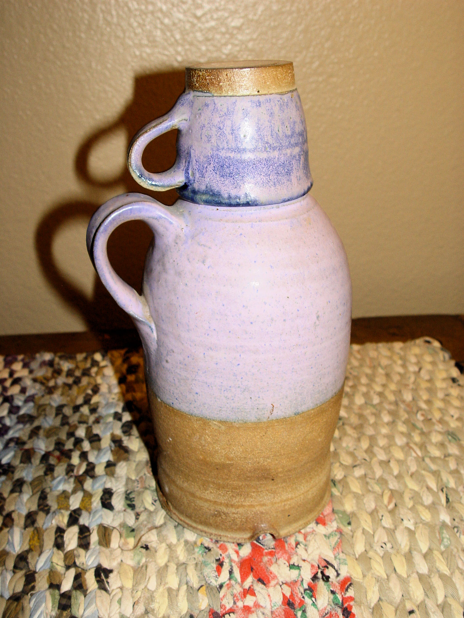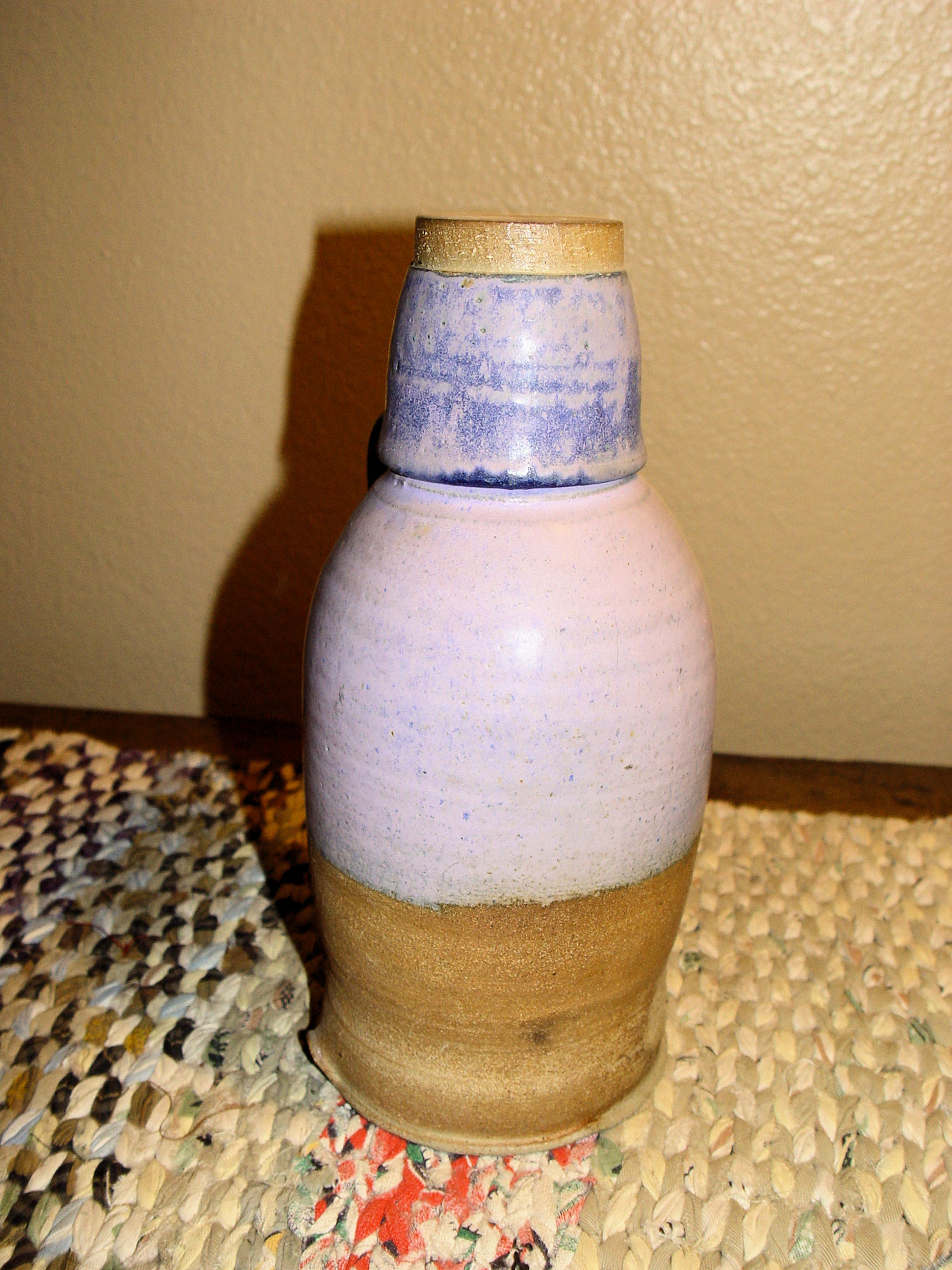 Vintage artist signed Studio pottery jug with a cup that fits as a lid. Handthrown and very unique. Such beautiful coloration of violet to dark purple and mauve. The base is un-glazed and shows a drying crack that slightly goes through the date. It appears to show FSB and the date is '98. Tiny glaze pop on the very tip rim, very small. The cup is in excellent condition and shows throwing rings on a natural clay base.