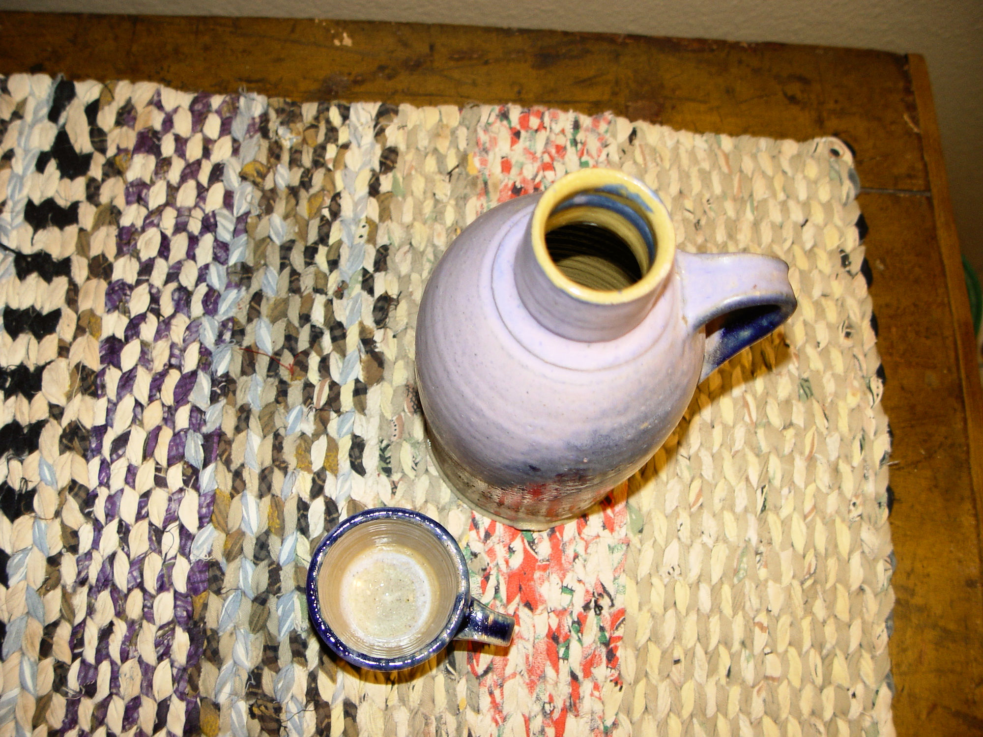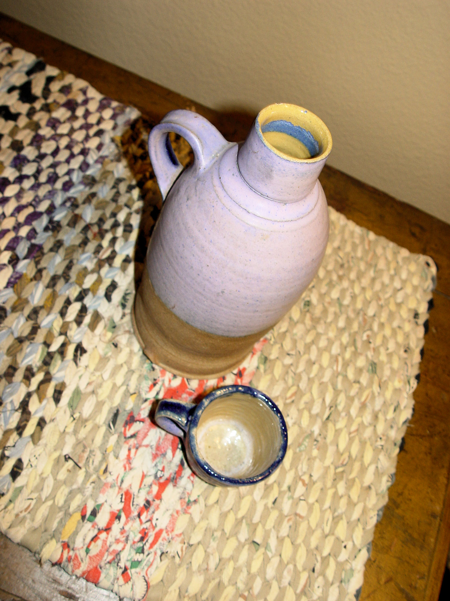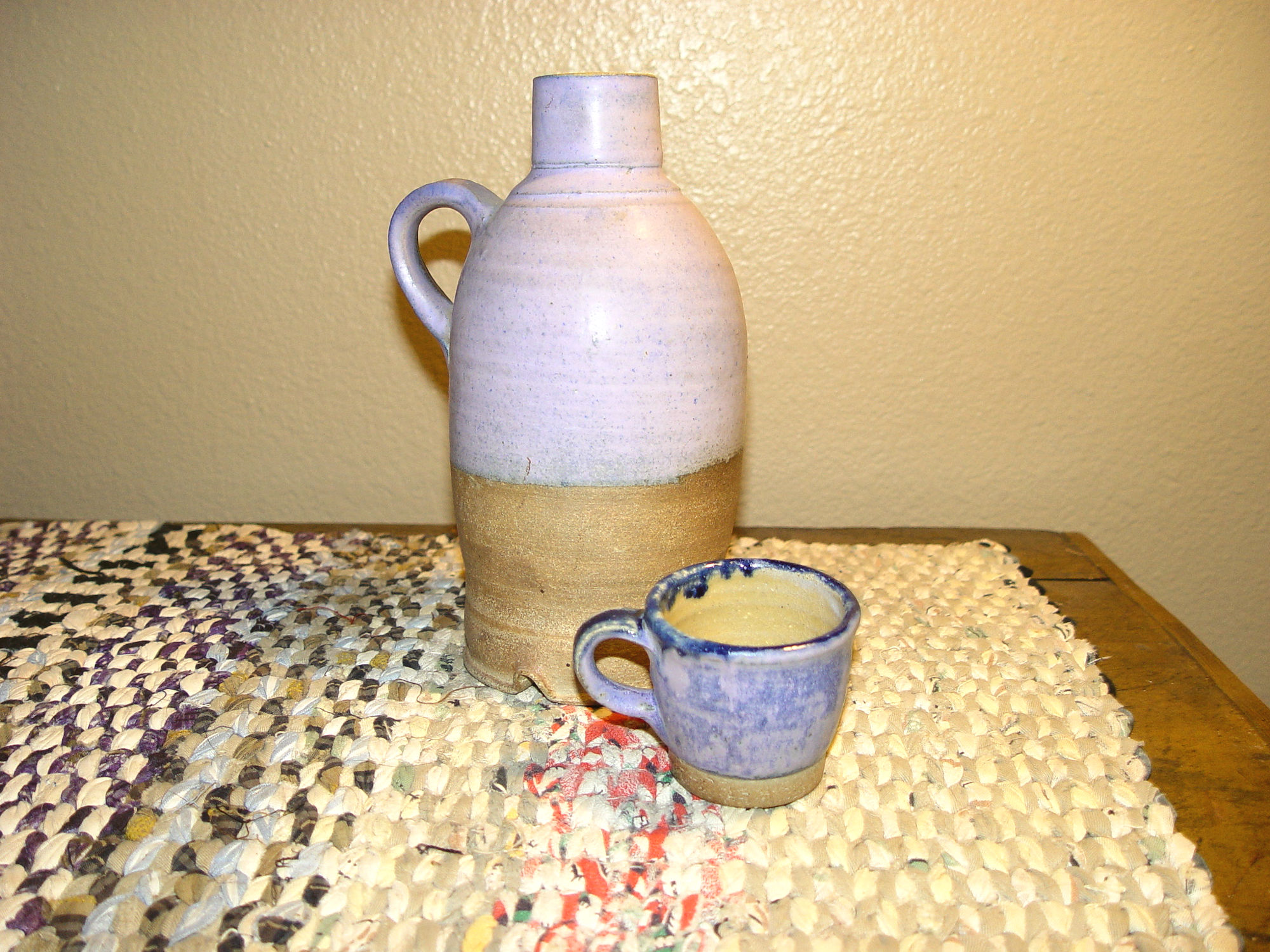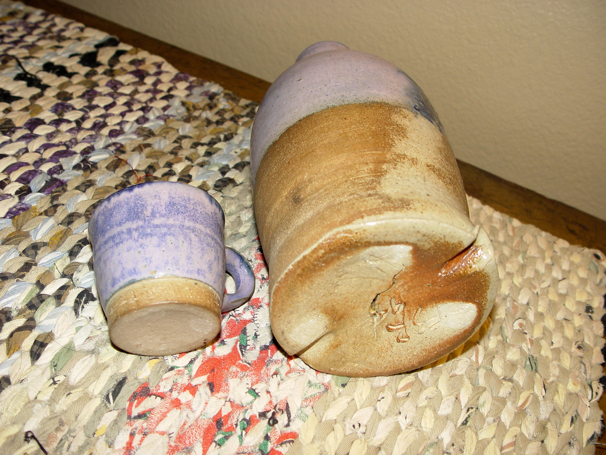 Vintage artist signed Studio pottery jug with a cup that fits as a lid. Handthrown and very unique. Such beautiful coloration of violet to dark purple and mauve. The base is un-glazed and shows a drying crack that slightly goes through the date. It appears to show FSB and the date is '98. Tiny glaze pop on the very tip rim, very small. The cup is in excellent condition and shows throwing rings on a natural clay base.