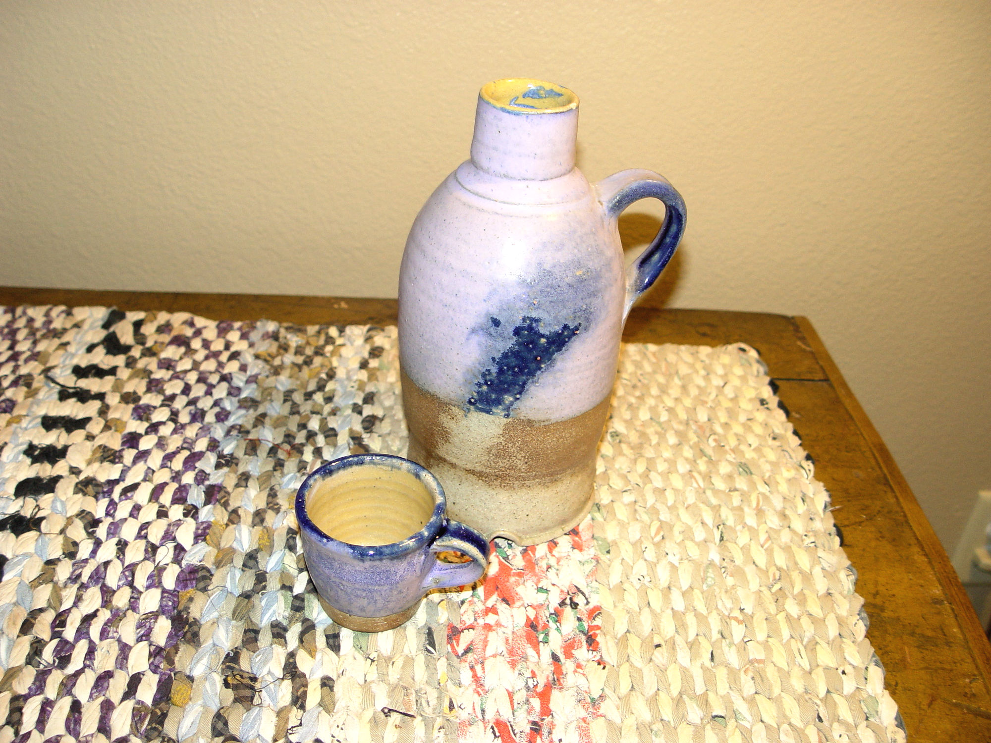 Measures 9" tall for the jug and 6" at its widest with handle.The cup measures approx. 2.5" tall by 3.75" wide with handle. This is a beautiful signed and dated piece.
