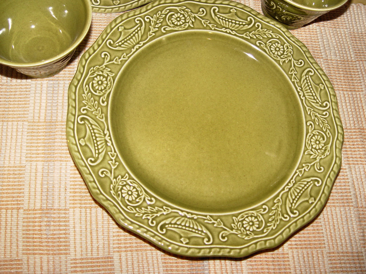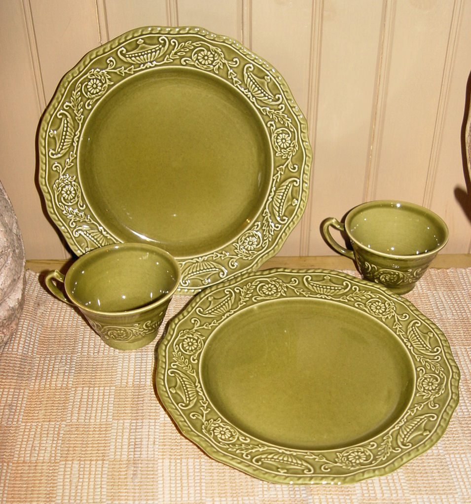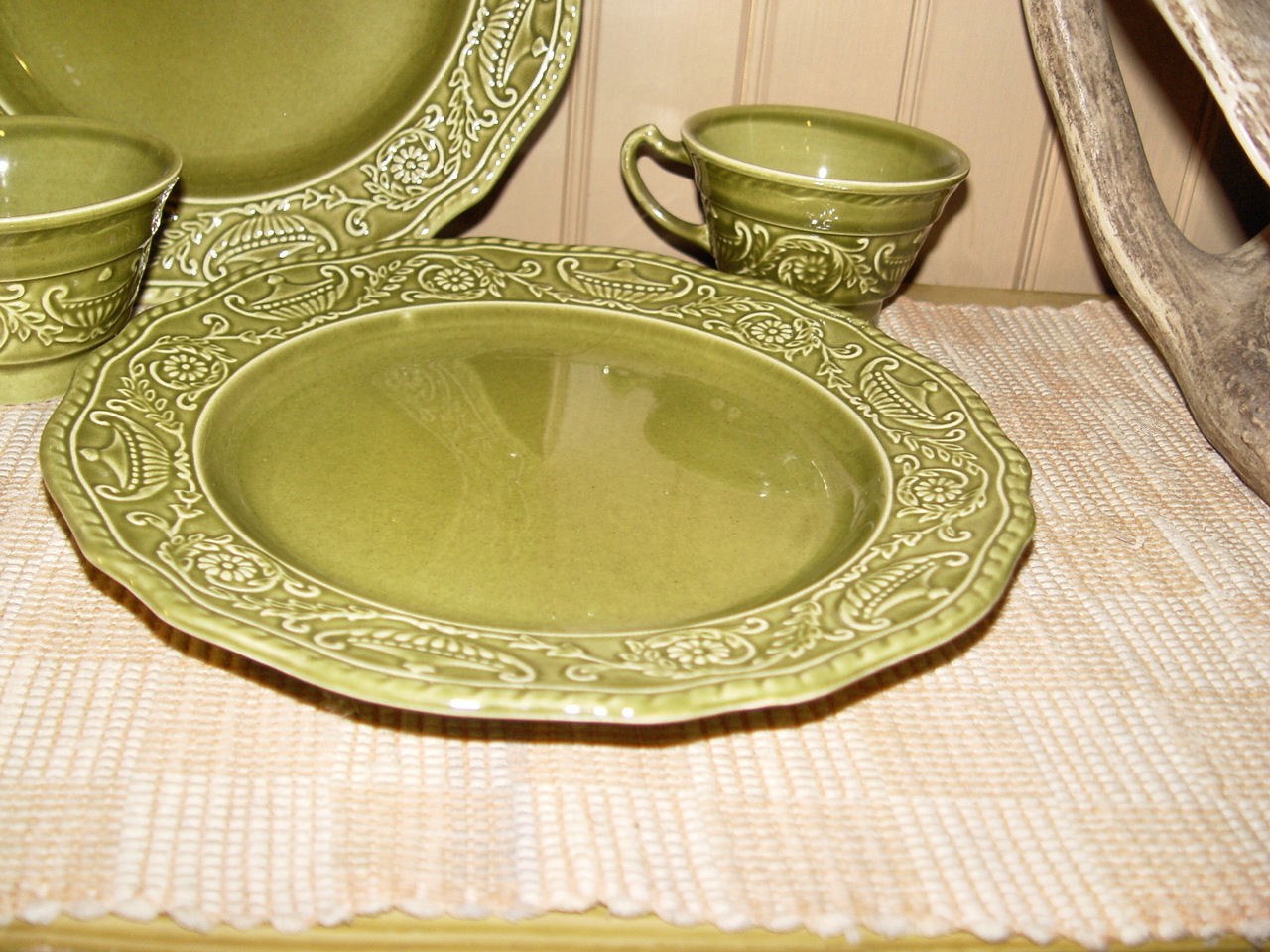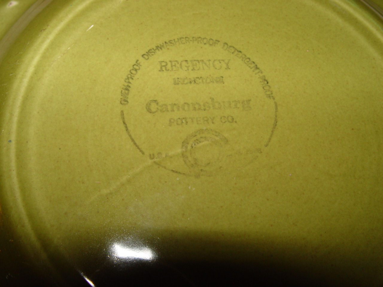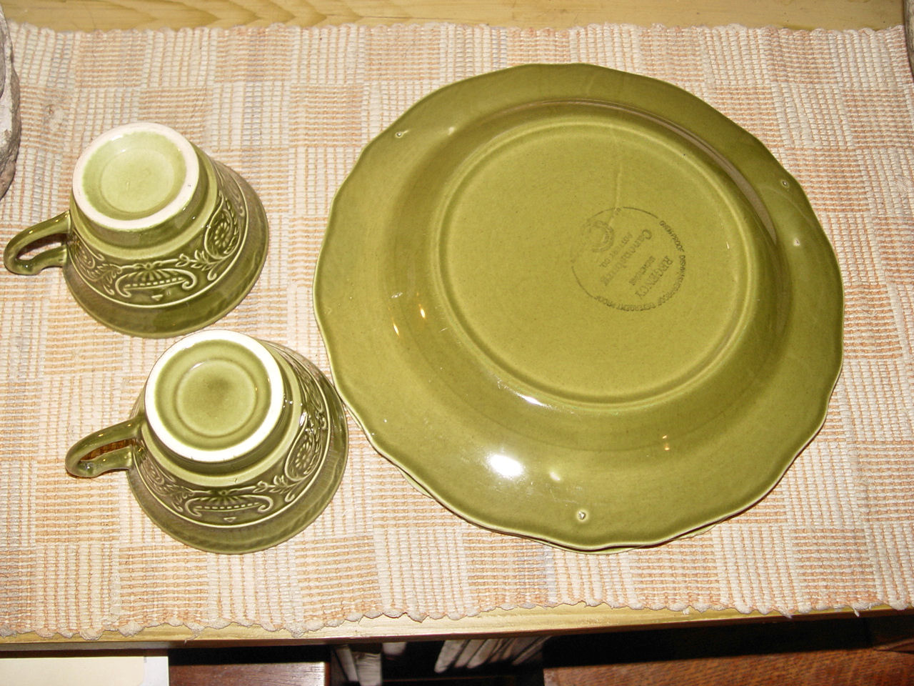 Very pretty vintage charm to add to your dining table. Two 10" green dinner plates and two lone cups from the Canonsburg Pottery's Regency Stoneware collection, circa 1968. Made in the United States. Perfect for everyday use or special occasions. The timeless design make them a great addition to any collection of dinnerware. Each plate features the iconic Canonsburg Pottery makers mark on the bottom. Very good condition.