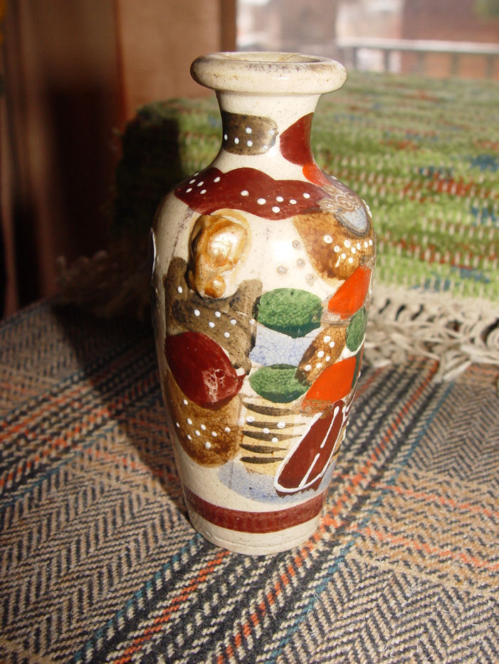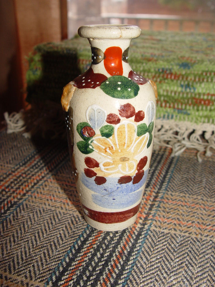 This is a very lovely earthenware pottery Kyoto styled vase made I believe sometime during 1910-1950. It has the Moriage hand painting and measures approx. 5" tall by 3" at the widest and has a 1 3/8" diameter base.