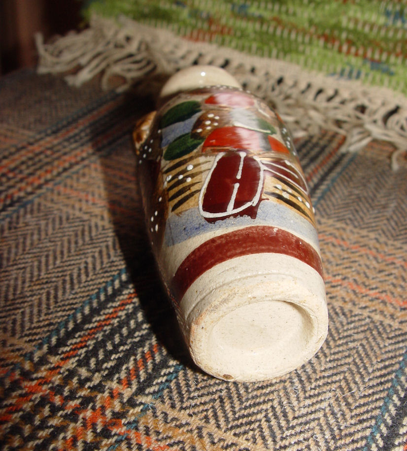 There are no markings on the bottom which is typical for the time. This does show a repaired crack at the top of the mouth but definitely much too pretty to throw out. Beautiful coloration's with embossed elephants on each side. Geisha almost hidden upper top of one side.