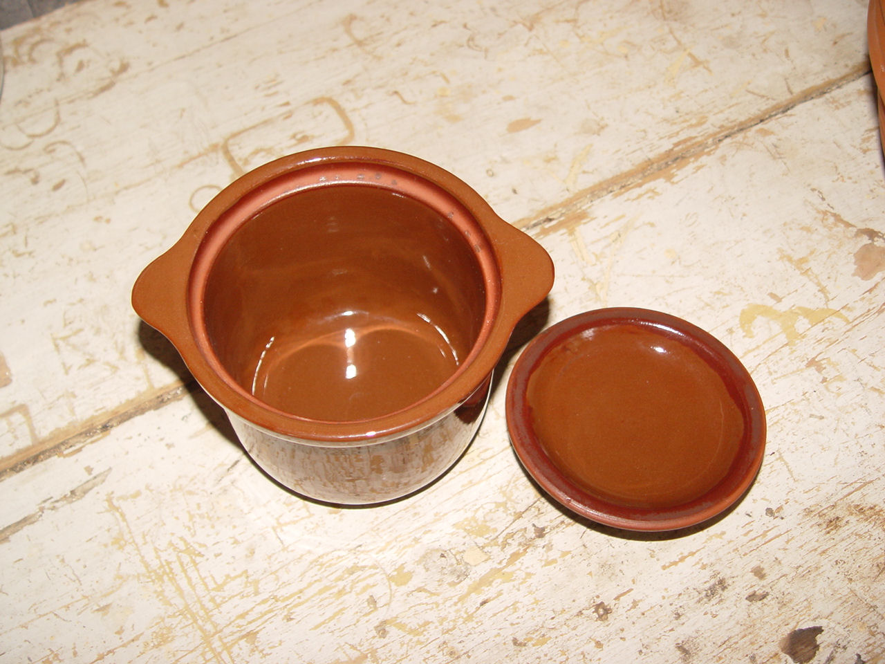 Very nice early redware lidded pot measuring approx. 5" by 6.5" to handle ends. This piece has the appearance of a bean pot and is in very good condition.