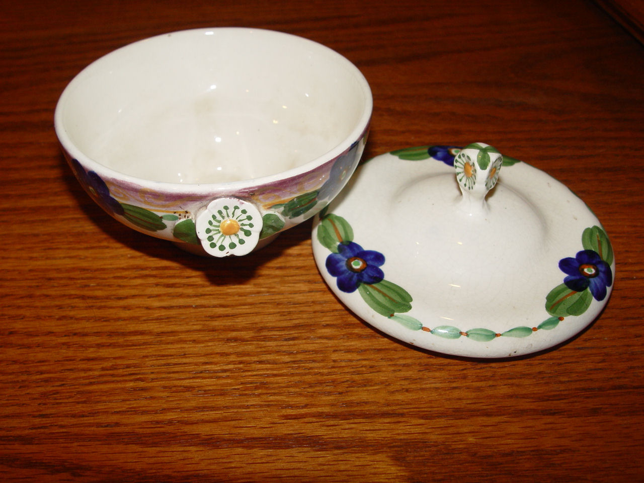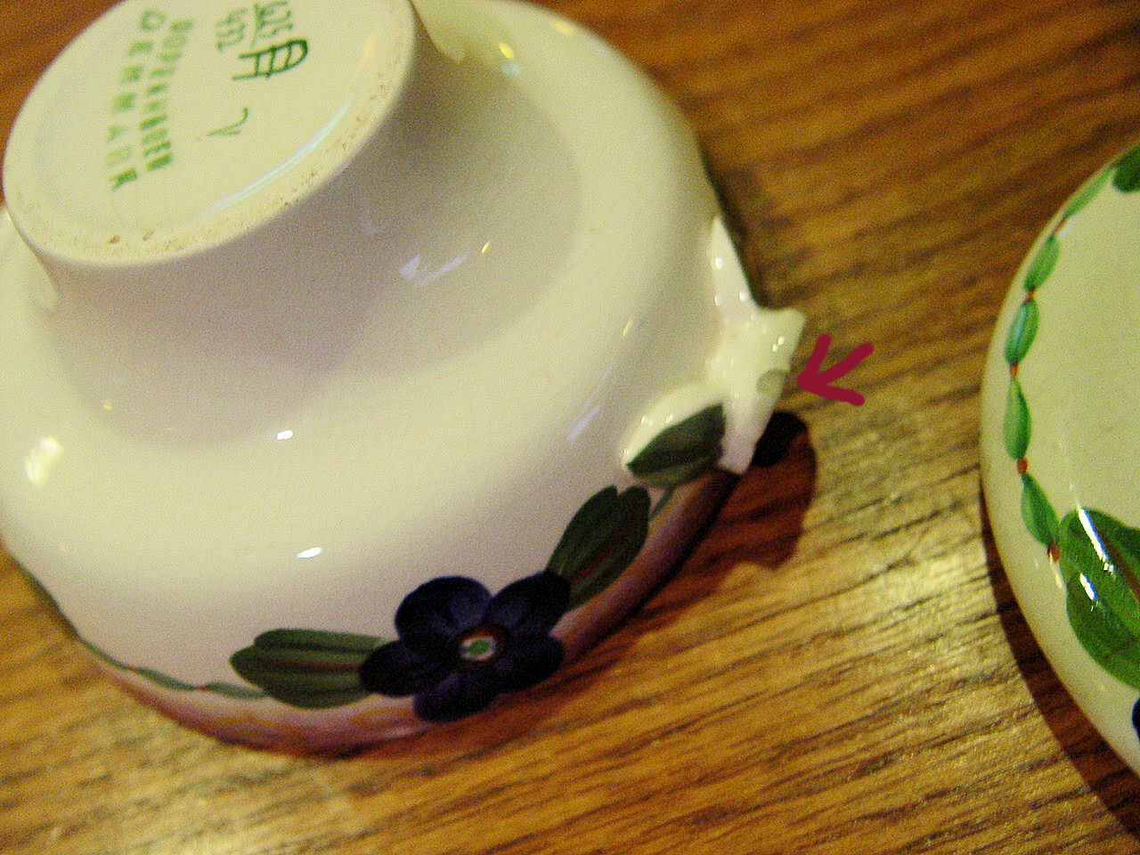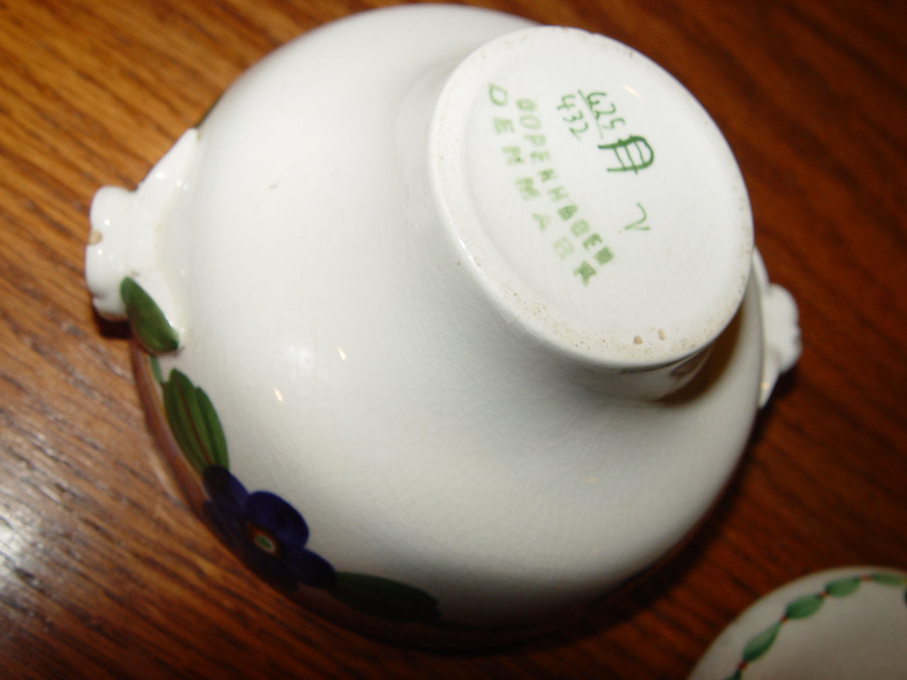 A very pretty Rare 1906 Royal Copenhagen Aluminia Kunstfajance lidded sugar set with the old beehive marking and green mark. The bottom number 625/432 dates this piece to 1906. Beautiful deep blue flowers with green leaves. Floral knobs for the lid as well as both handles. Unique. Signed with what looks to be a V. It bears the early beehive mark, Copenhagen Denmark. This has crazing throughout with two tiny old chips under each handle see last photos.