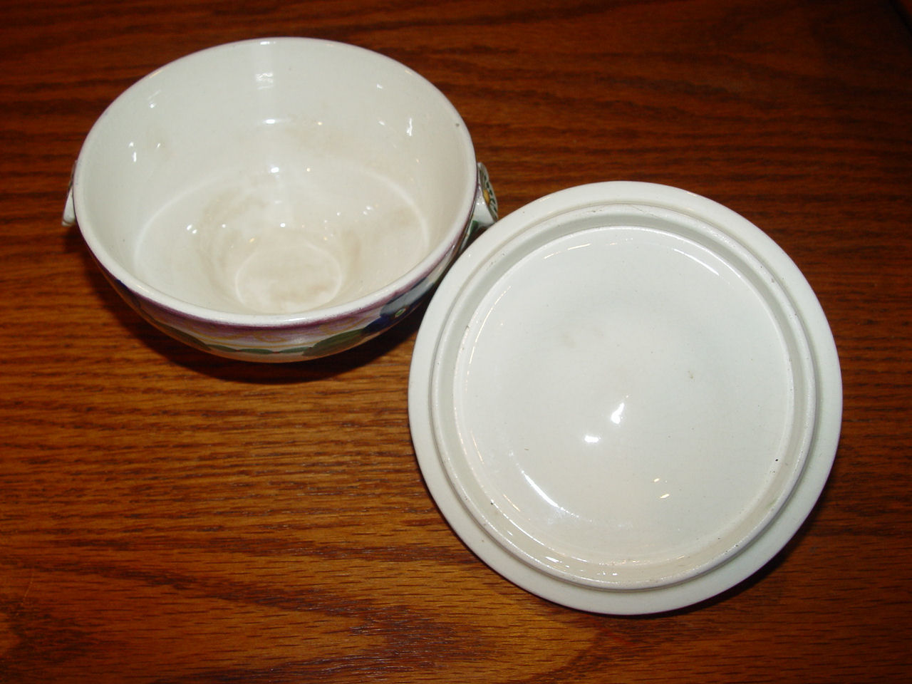 Sugar bowl with lid measures approx. 3 5/8" tall X 4.75" handle-to-handle.