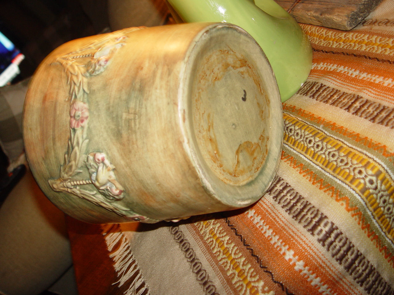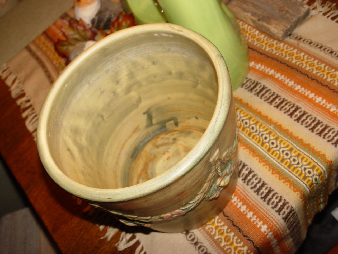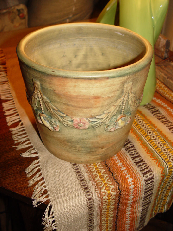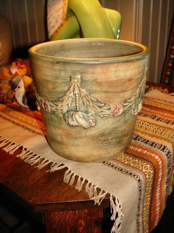 This is a beautiful Weller Woodcraft Flemish jardiniere. This has a classic flower pot form. It is adorned with wonderful garlands of flowers and fruit, with gorgeous yellow song bird medallions. The details are exceptional. It shows a soft glaze in Weller's signature woodsy colors with blushes of muted red and yellows in the blossoms and birds. This jardiniere seems unmarked, but I can just make something out below an early price. Also showing a number three that someone put on with black ink.