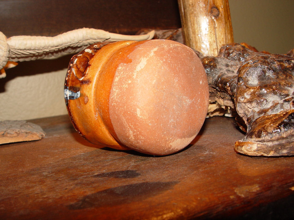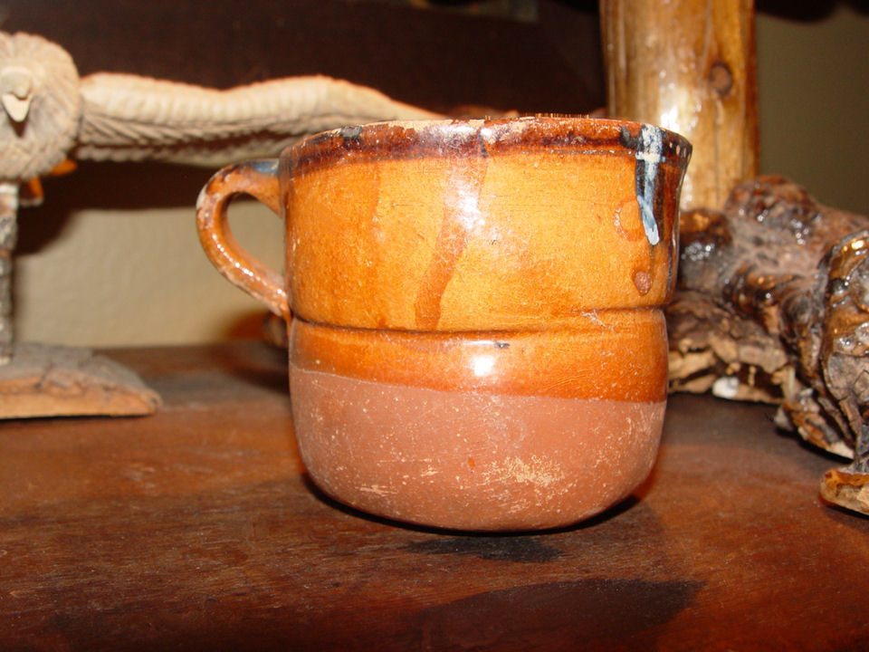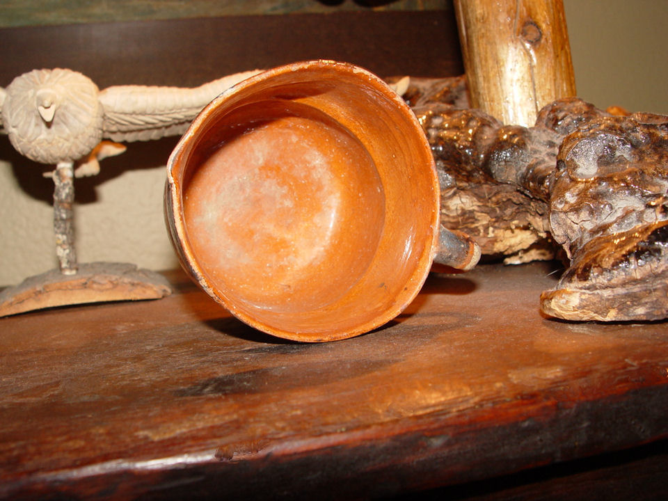 Early redware Tlaquepaque mug, cup or measuring vessel. No sure, but there is writing on the piece that may signify a measuring cup. Irregular in shape and very early compared to most items of it's kind. This shows a very small start to a spout at the mouth.