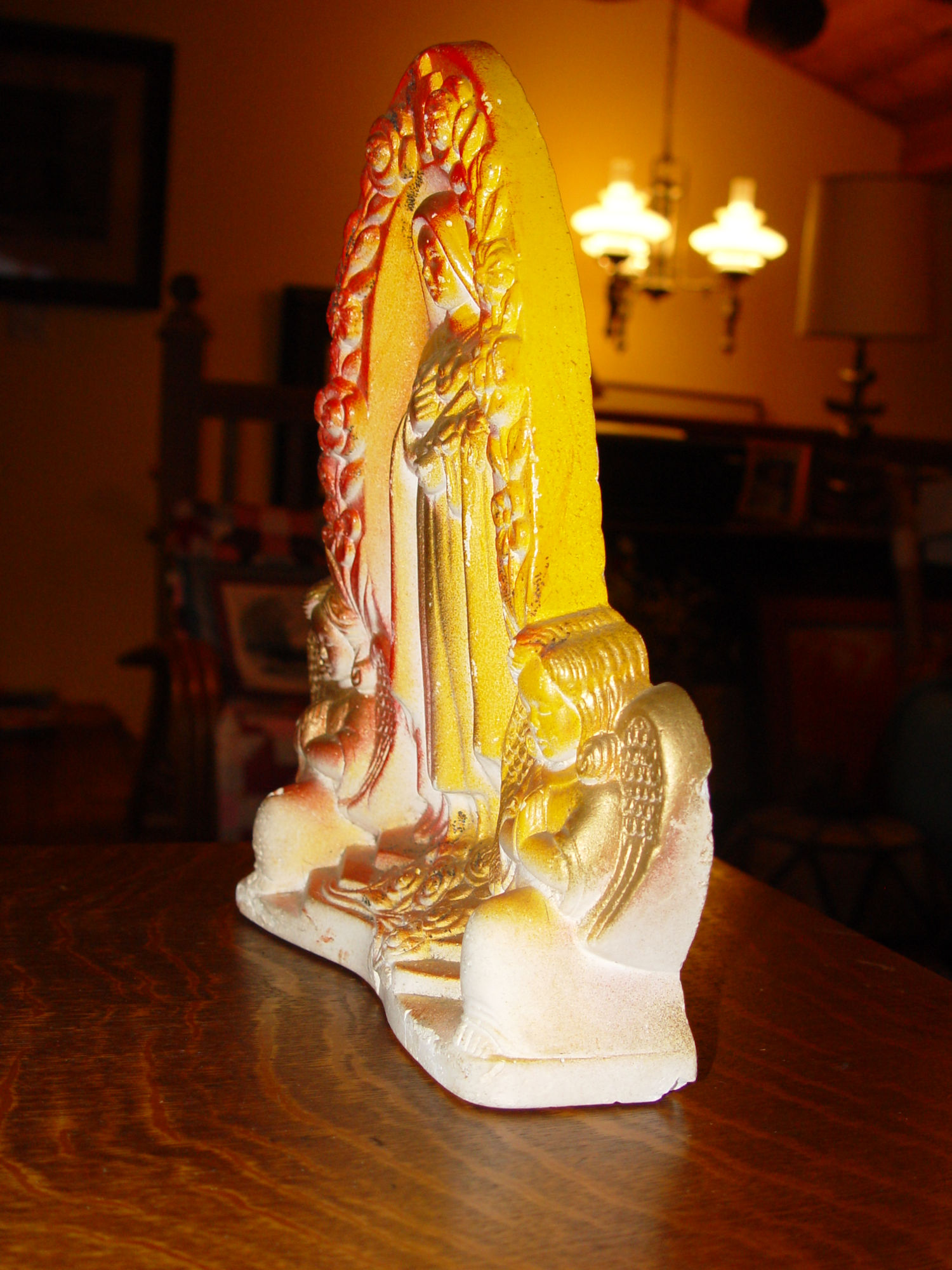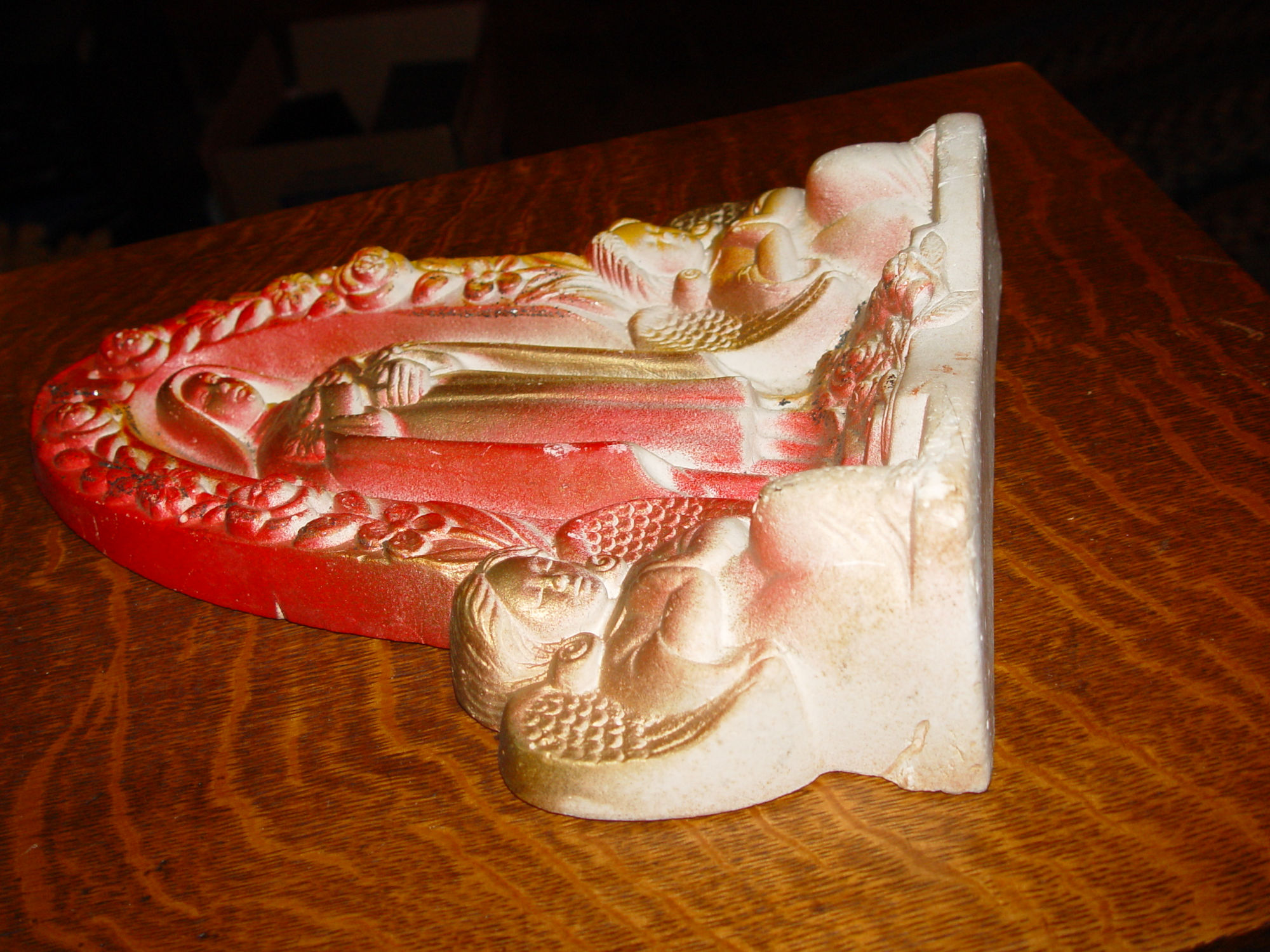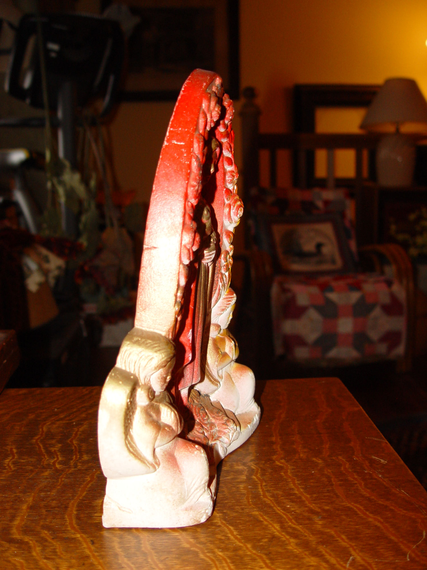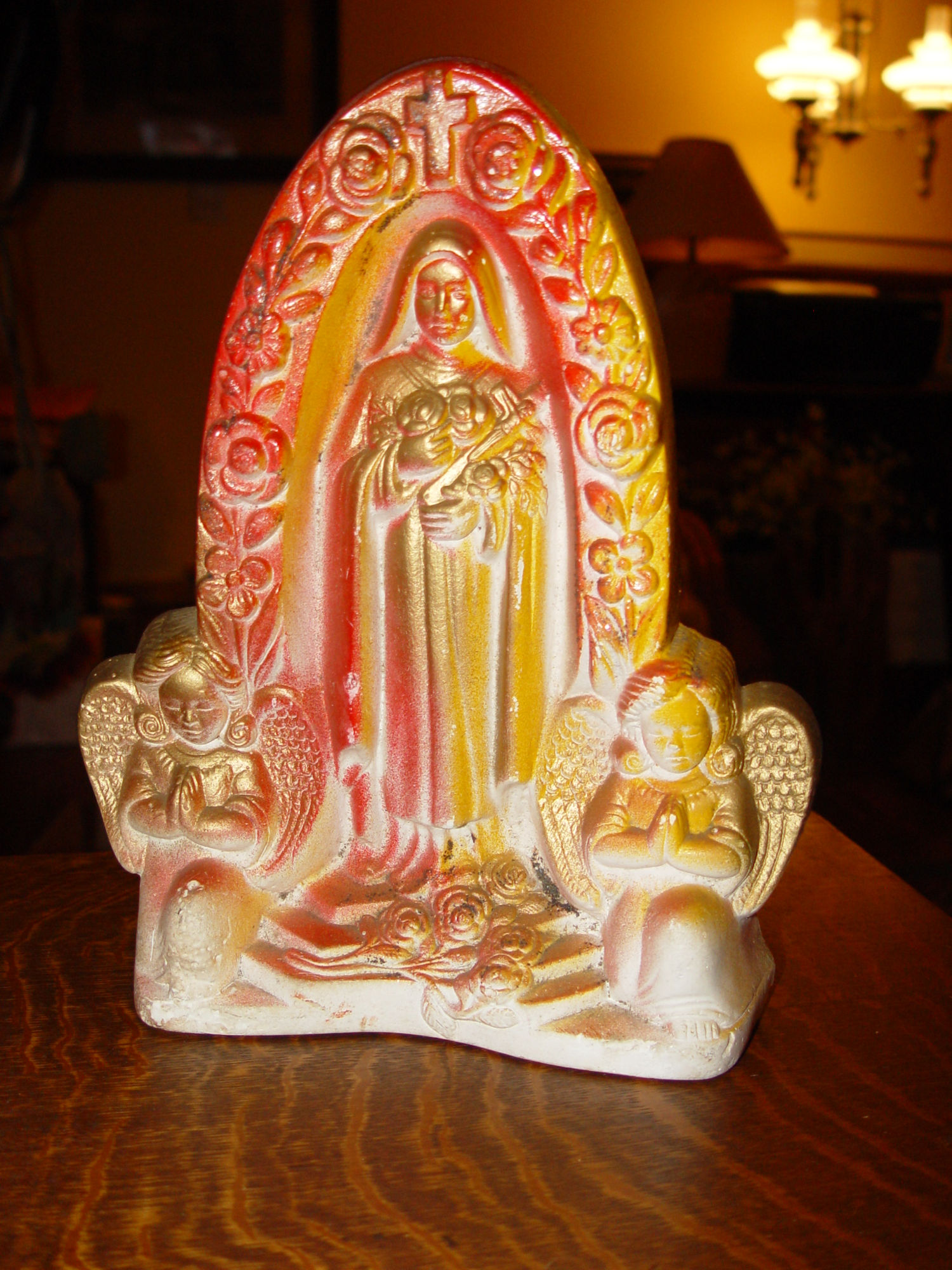 Early chalkware statue of St. Theresa of Lisieux, also known as Saint Thérèse of the Child Jesus and the Holy Face or " The Little Flower". She is holding a Cross and a bouquet of Roses with many roses strewn at her feet. Two small children angels kneel at either side of the floral arch that she stands under. The piece has golds and reds painted on it with glitter hear and there. Perfect Mother's Day, Confirmation, Baptism or the Christmas Holiday. Also a wonderful Get Well Gift. This has weathered the years well with only very minor small scratches or marks. Beautiful and colorful Religious art!
