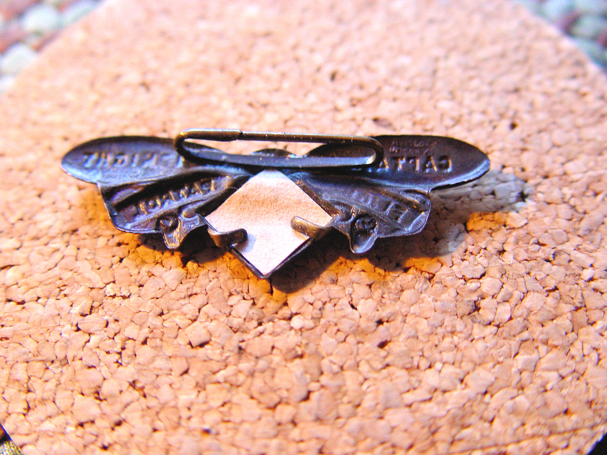 die-cut. Approx. 2" wide in brass with airplane propeller