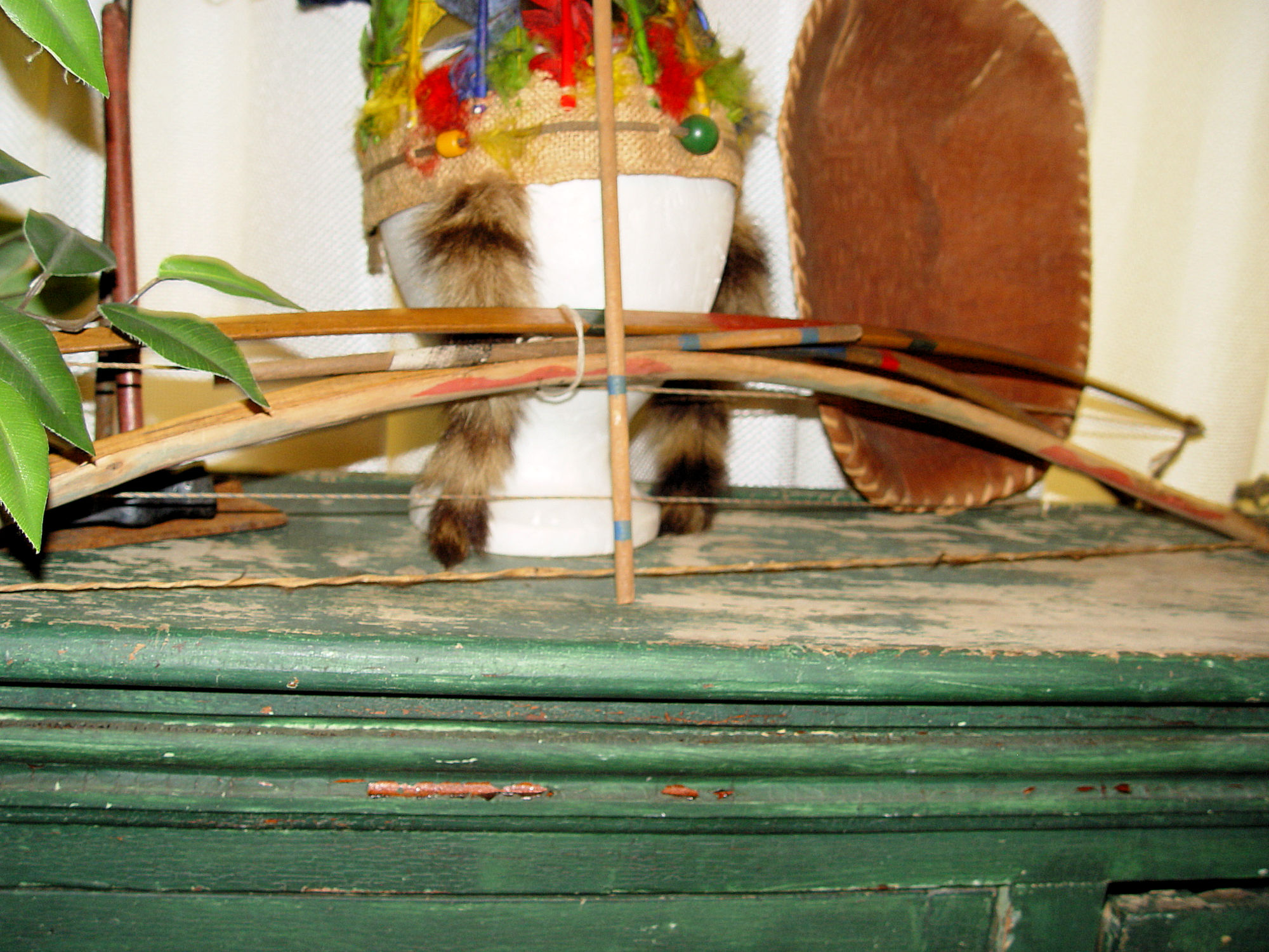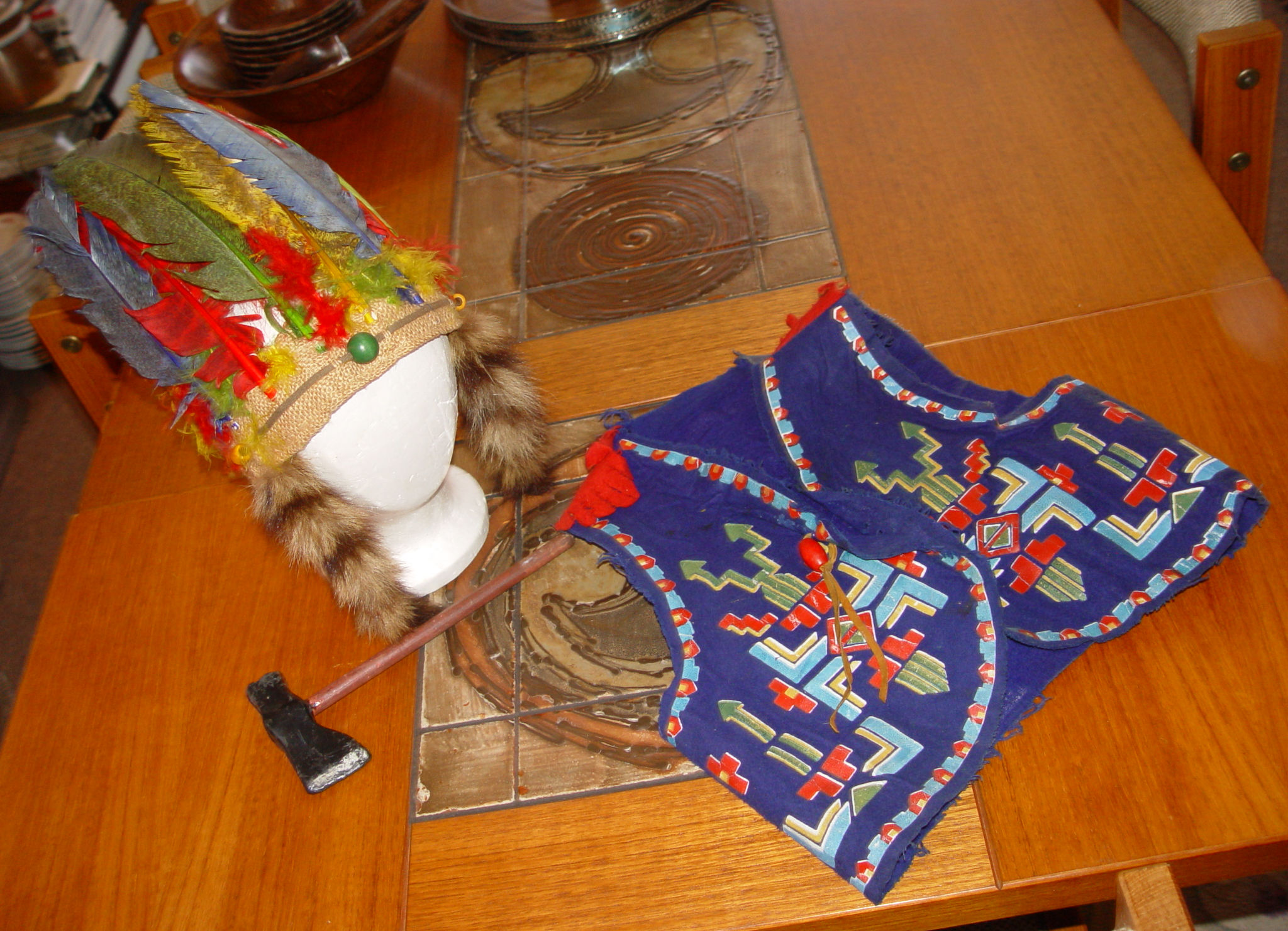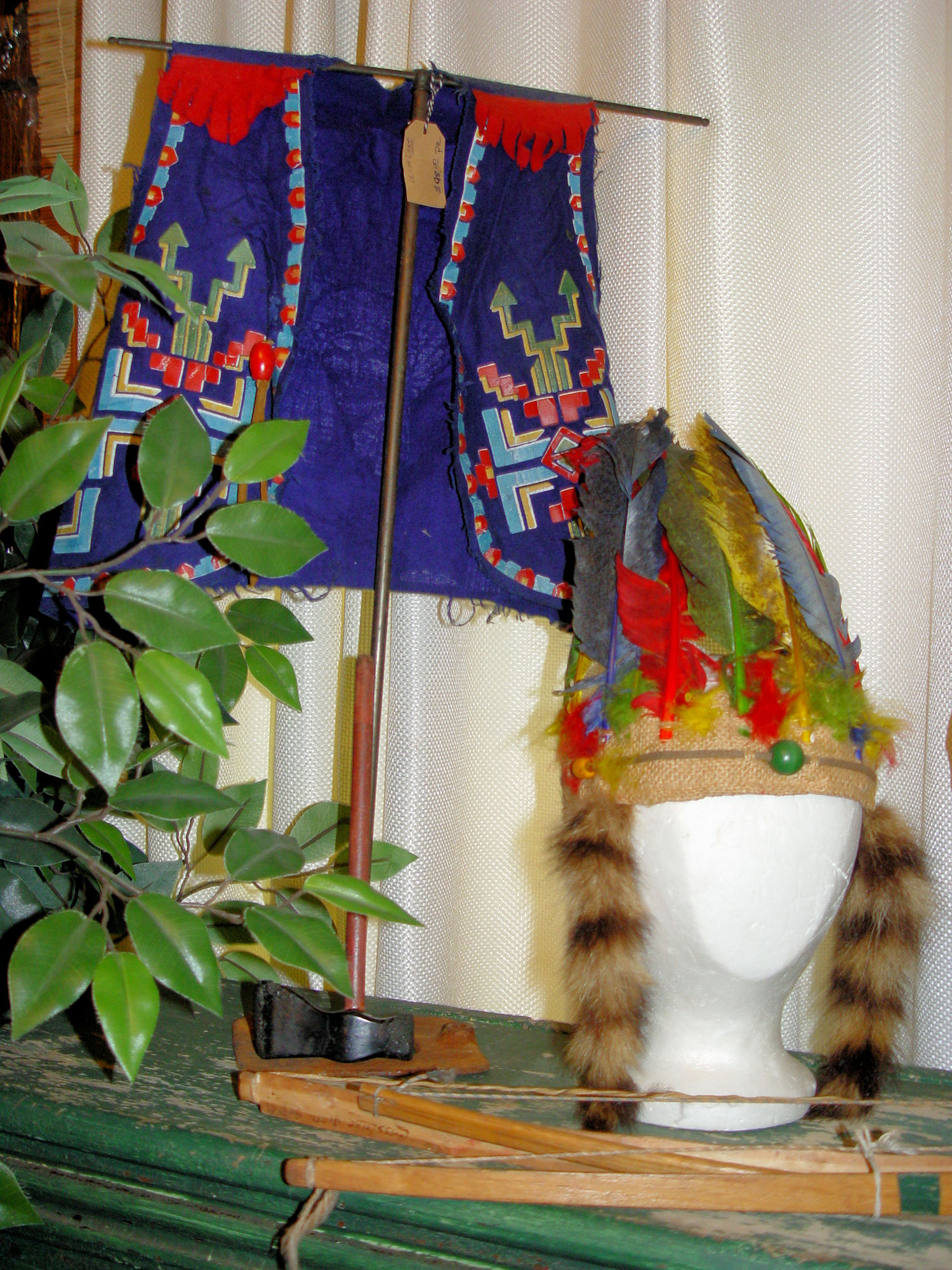 Bright colored feathers and burlap make up the headdress showing