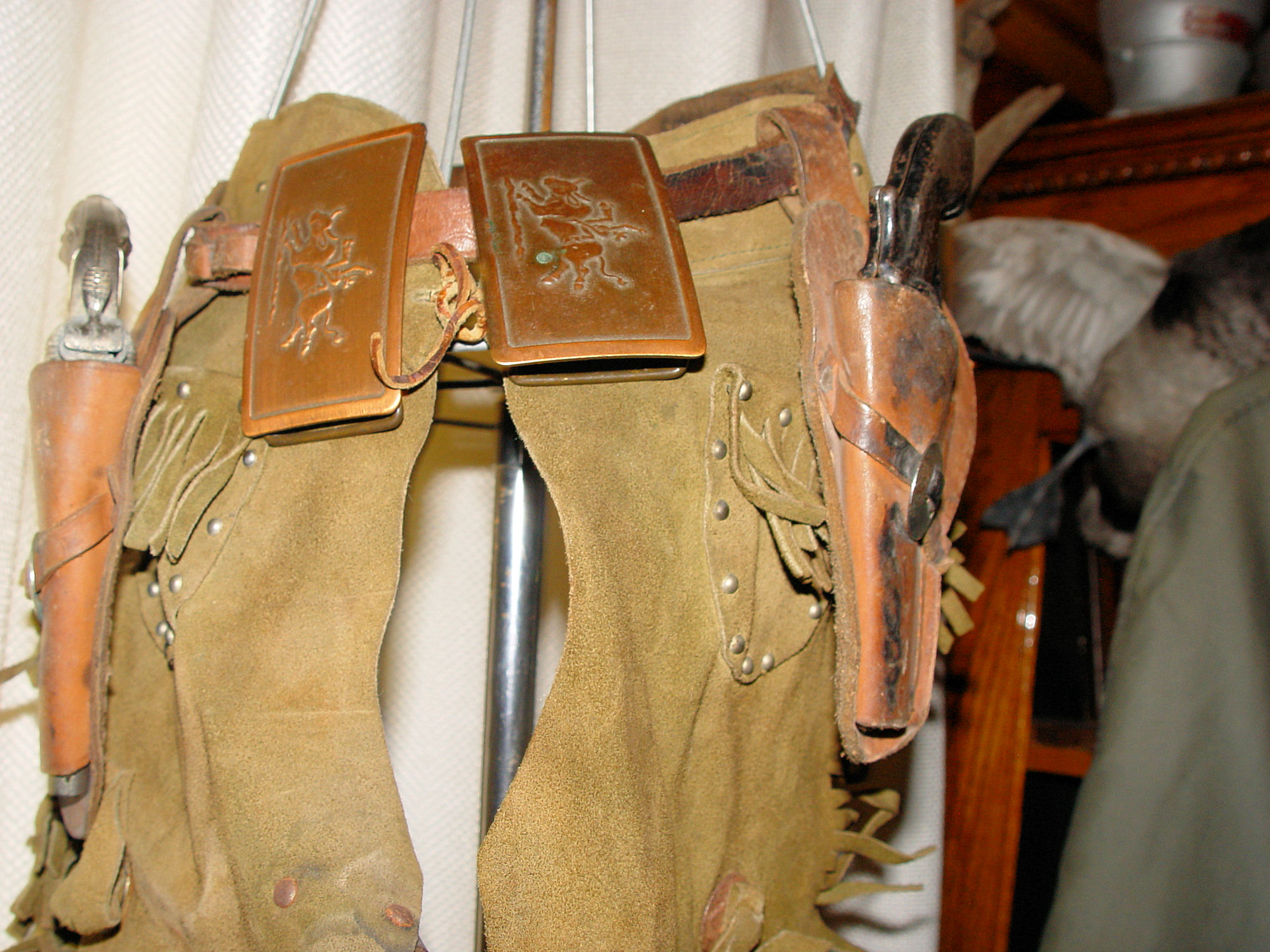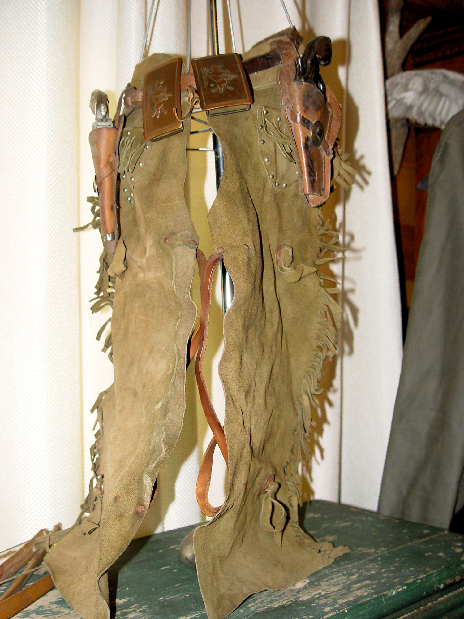 The Chaps are leather and very realistic. Small belt with holsters