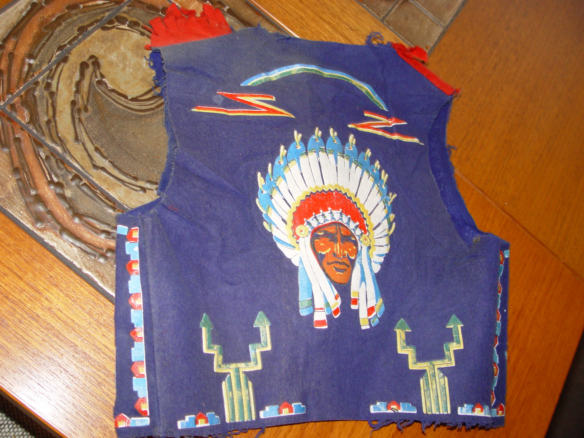 design with an Indian Chief on the back. The edges are frayed a