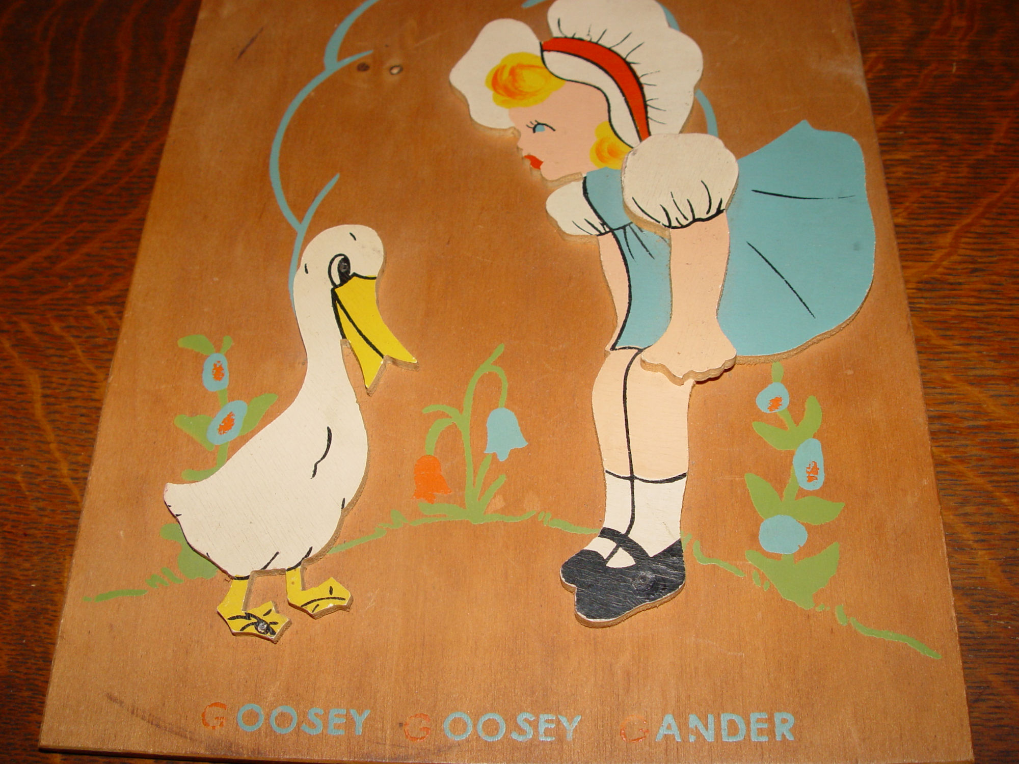 Hand painted wooden nursery rhyme wall plaque that is regarding the very early Goosey Goosey Gander. 3D in nature with the cutout wood raised above the panel. Hooks on back, ready to hang in a Nursery or child's room.